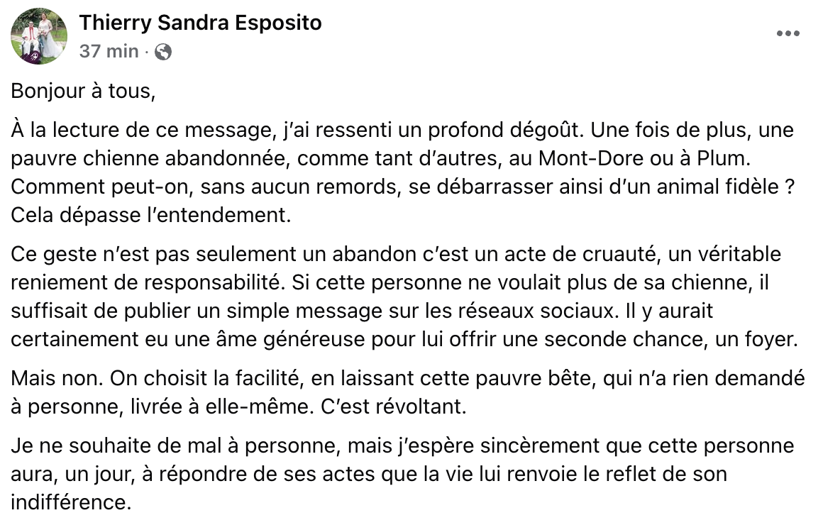 Ce geste n’est pas seulement un abandon, c’est un acte de cruauté, un reniement de responsabilité. Il suffisait de publier un message sur les réseaux, une âme généreuse aurait offert un foyer.