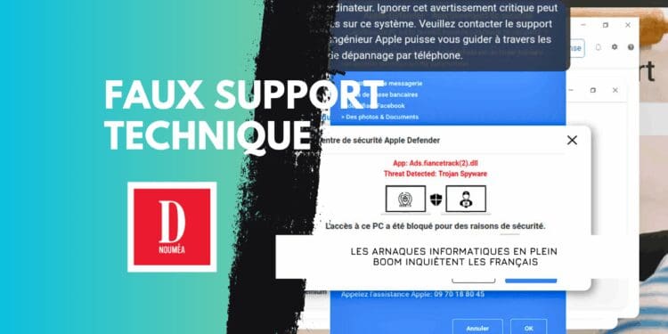 En 2024, l’arnaque au faux support technique est devenue la troisième menace en France pour les particuliers derrière l’hameçonnage (ou phishing) et le piratage de compte, selon Cybermalveillance.gouv.fr. La méthode ? Un message effrayant sur fond bleu bloque l’ordinateur et invite à appeler un « service dépannage », offrant une fausse assistance contre paiement.