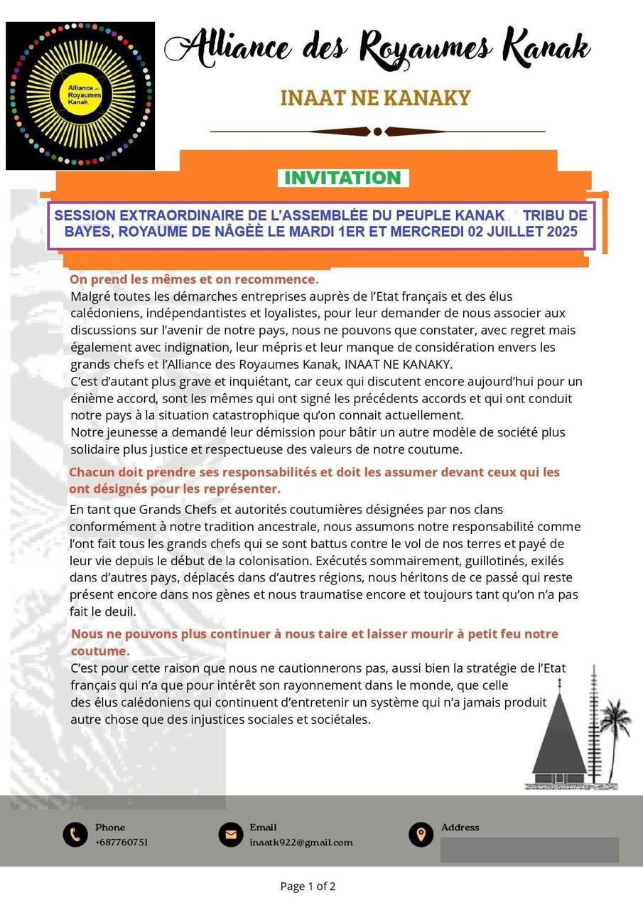 Face à ce qu’elle perçoit comme une exclusion, l’Alliance organise sa propre assemblée. Les 1er et 2 juillet 2025, une session extraordinaire de l’Assemblée du peuple kanak se tiendra dans la tribu de Bayes, au royaume de Nâgèè. Un événement destiné à marquer un désaccord radical avec les travaux de l’Élysée, et à revendiquer une souveraineté politique, culturelle et spirituelle.