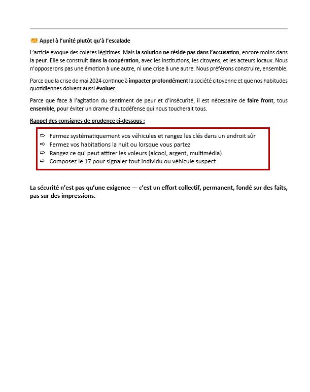 La mairie mise sur la coopération avec les citoyens, les institutions, les coutumiers et les forces de sécurité. L’heure n’est pas à la division, mais à l’union des volontés face aux défis de la sécurité publique.