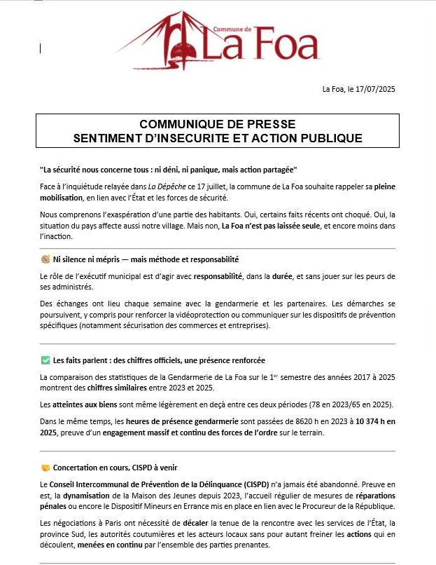 La sécurité ne relève pas d’une seule autorité, insiste la commune. C’est un travail collectif, permanent, fondé sur des faits et non sur des peurs. Et pour La Foa, ce travail est déjà bien engagé.