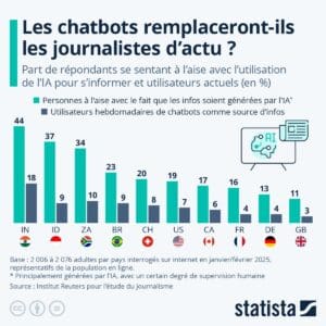 C’est une petite révolution silencieuse : dans de nombreux pays, l’intelligence artificielle s’invite dans les habitudes d’information. Selon une enquête menée par le Reuters Institute en janvier-février 2025 auprès de plus de 2 000 adultes par pays, les chatbots générateurs d’actualités sont déjà utilisés chaque semaine par 18 % des Indiens, 10 % des Sud-Africains, 9 % des Indonésiens… mais seulement par 3 % des Britanniques.