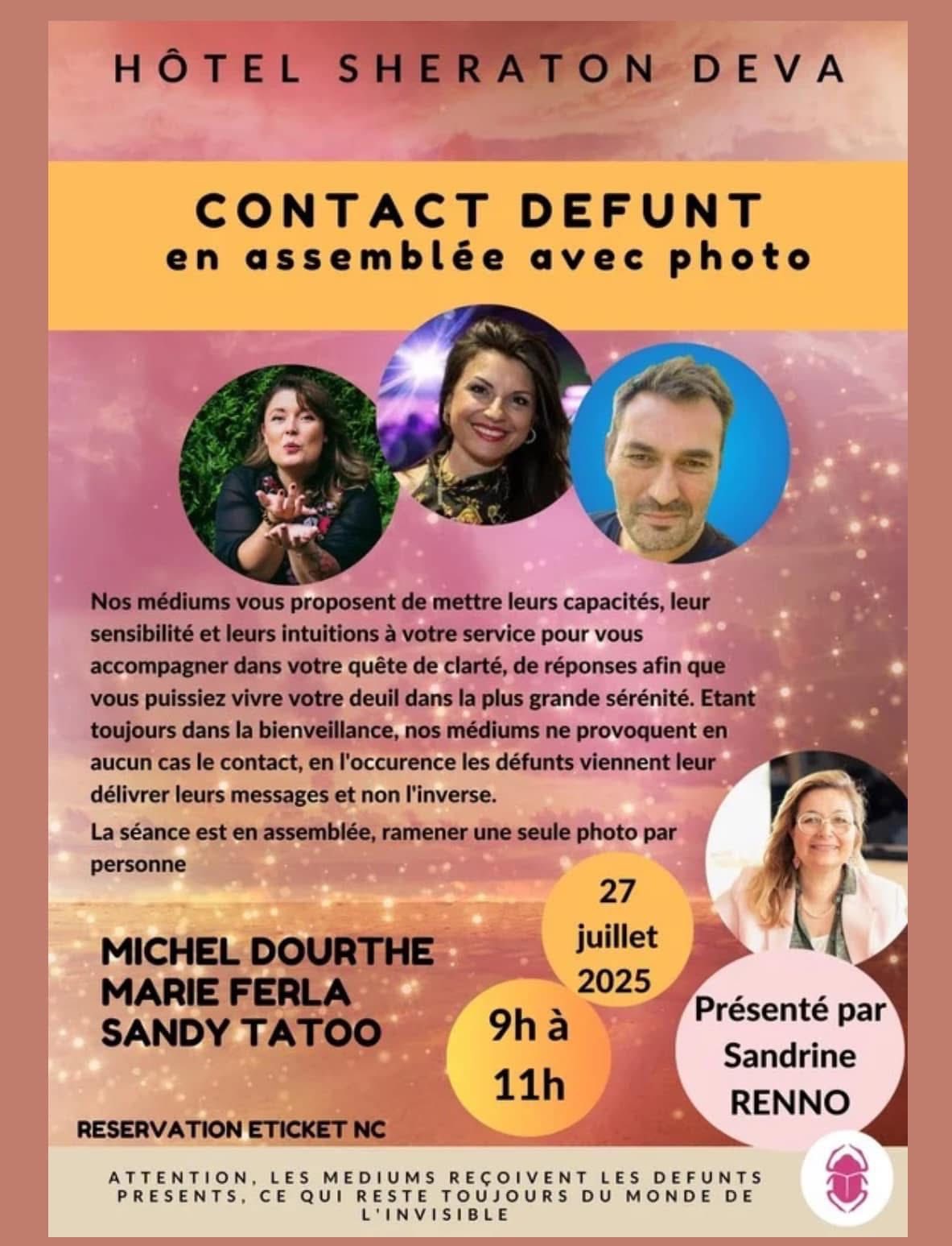- Michel Dourthe, médium reconnu en France et en Suisse, spécialiste des sessions publiques de contact avec les défunts. Il propose une approche directe, sobre et respectueuse, avec une solide réputation dans le monde des conférences spirites.