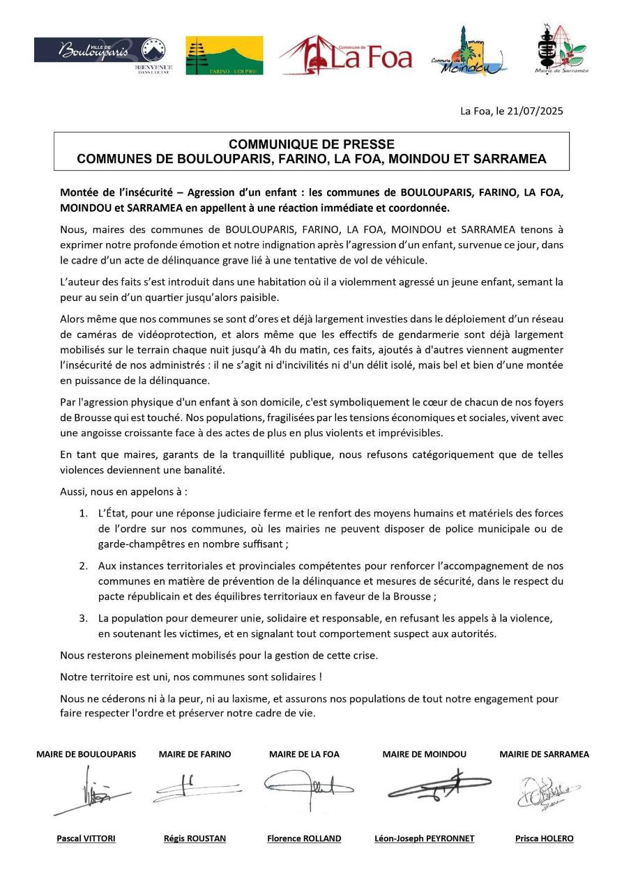 Les maires de Boulouparis, Farino, La Foa, Moindou et Sarraméa dénoncent ensemble une escalade de la violence. Dans un communiqué commun diffusé le 21 juillet, ils expriment leur « profonde émotion » et une indignation partagée face à cet acte qu’ils qualifient de grave et symbolique.