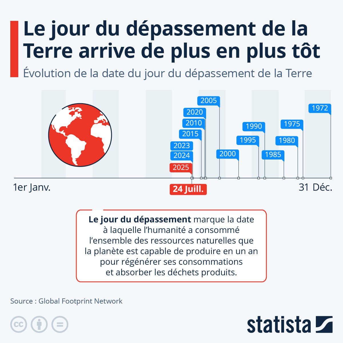 Le 24 juillet 2025 marque l’Earth Overshoot Day, date où l’humanité a épuisé les ressources renouvelables annuelles de la Terre, selon le Global Footprint Network (GFN). C’est une semaine plus tôt qu’en 2024 (1er août). En déficit écologique pour le reste de l’année, nous consommons 1,8 fois plus que la biocapacité planétaire, accentuant la pression sur les écosystèmes. Des actions urgentes sont nécessaires pour #MoveTheDate.