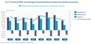 Les chiffres parlent d’eux-mêmes : -36 % pour les importations, -44 % pour les exportations. Le premier trimestre 2025 restera comme un moment noir pour le commerce extérieur calédonien. Le solde commercial, toujours déficitaire, atteint -23,7 milliards F.CFP, et le taux de couverture dégringole à 53,9 %. Autrement dit : pour 100 francs d’importations, seuls 54 francs sont couverts par les exportations.