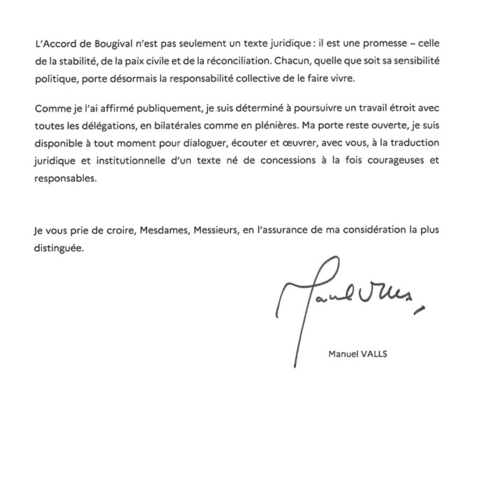 Les délégations politiques seront pleinement associées à chaque phase de rédaction. Valls insiste sur une porte ouverte au dialogue et sur un travail étroit, en bilatérales comme en séances plénières. Il rappelle que l’accord est une promesse de stabilité, de paix civile et de réconciliation, et que chacun porte désormais la responsabilité collective de le faire vivre.