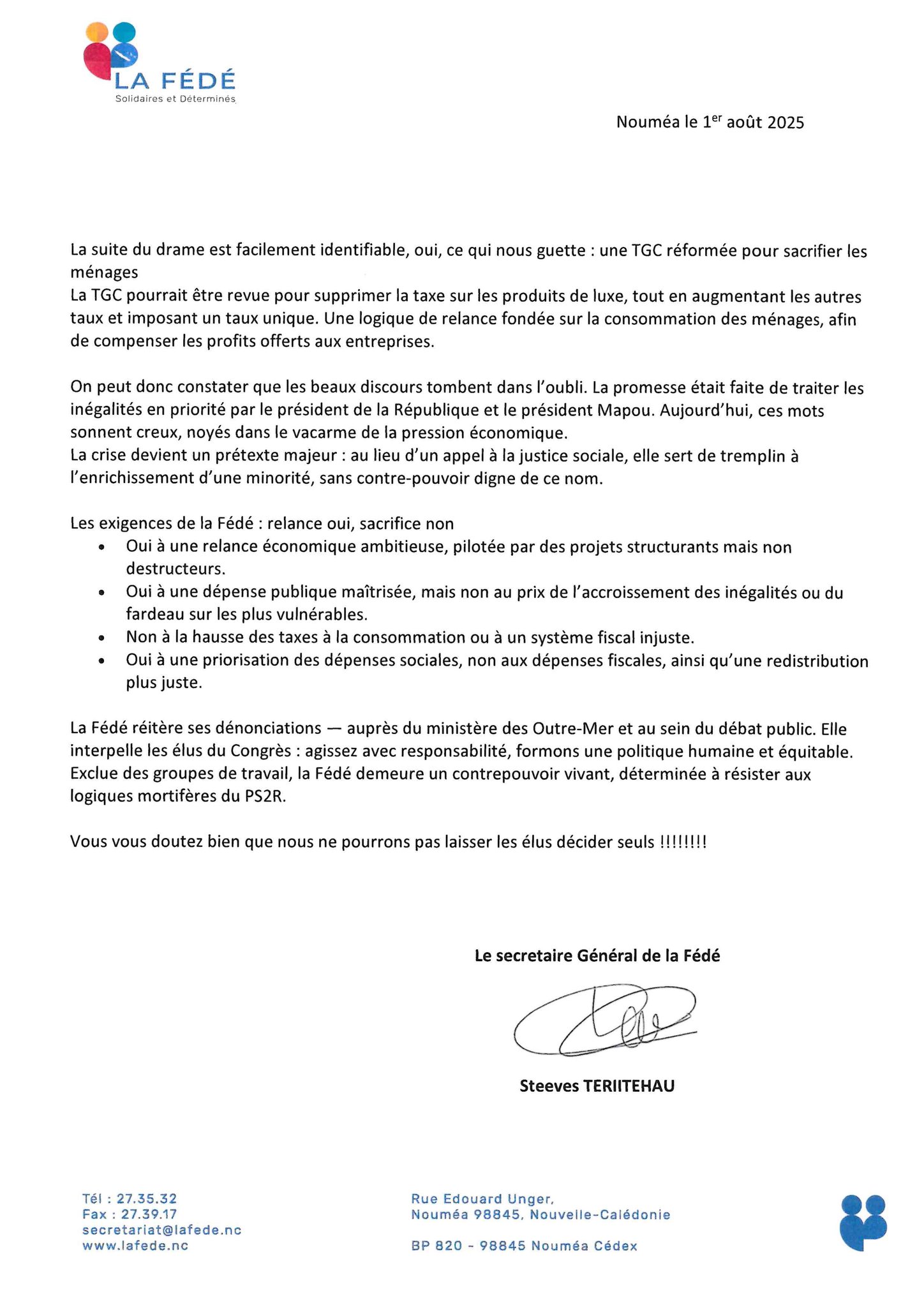 Elle invite les élus du Congrès à sortir du confort politique et à reprendre la main sur les orientations budgétaires. Elle appelle le ministère des Outre-mer à entendre ses alertes, et interpelle directement l’opinion publique. Pour la Fédé, le projet PS2R repose sur un double langage : derrière les promesses d’équité, c’est un programme d’inégalités institutionnalisées qui se met en place.