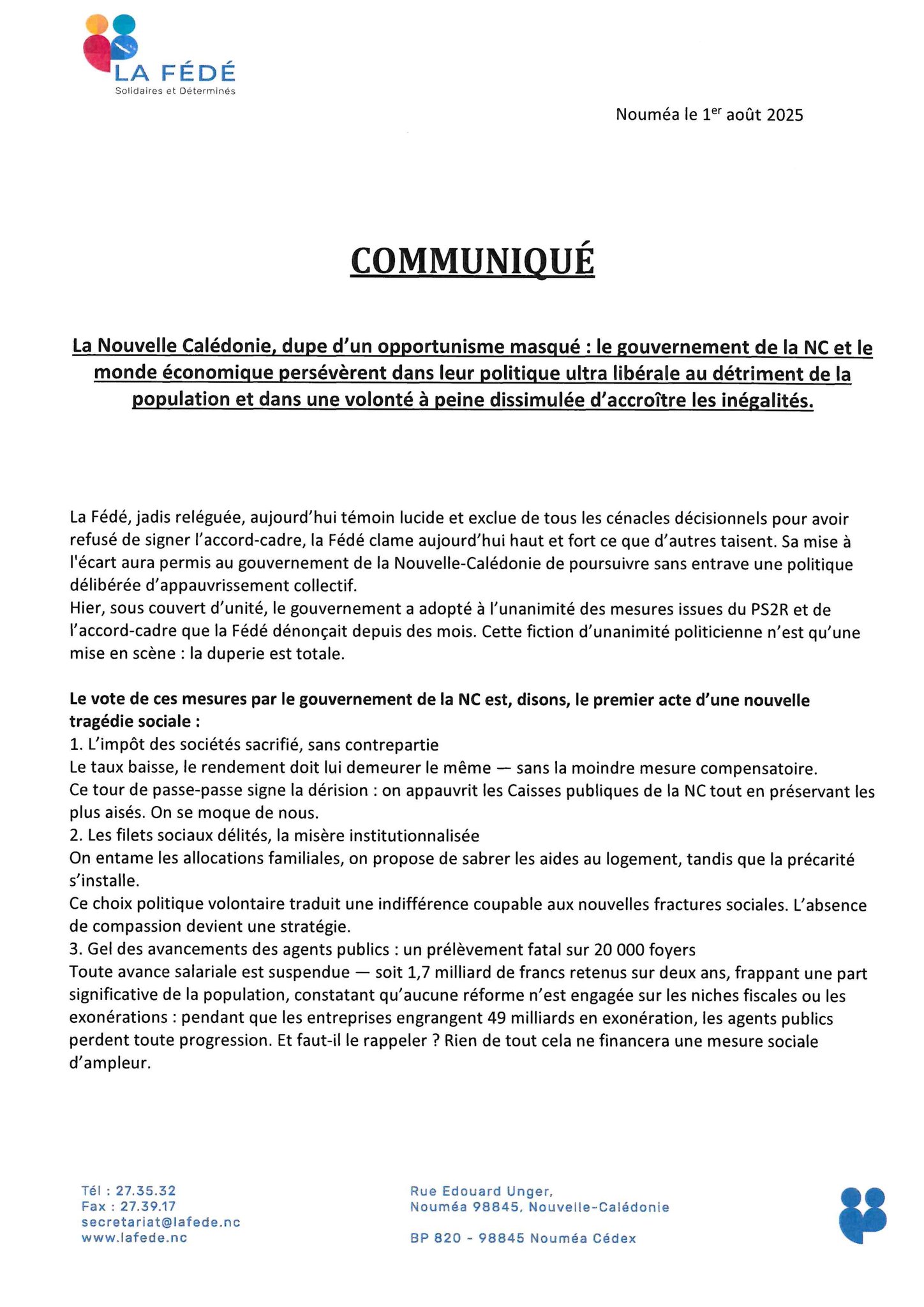 Il s’agit là de l’une des critiques majeures du communiqué : le gel des avancements des 20 000 agents publics calédoniens, soit 1,7 milliard de francs bloqués sur deux ans. Une mesure brutale, qui contraste avec le maintien intégral des exonérations fiscales en faveur des entreprises, chiffrées à 49 milliards. La Fédé dénonce un traitement inégal, qui pénalise les familles salariées tout en épargnant les plus puissants.