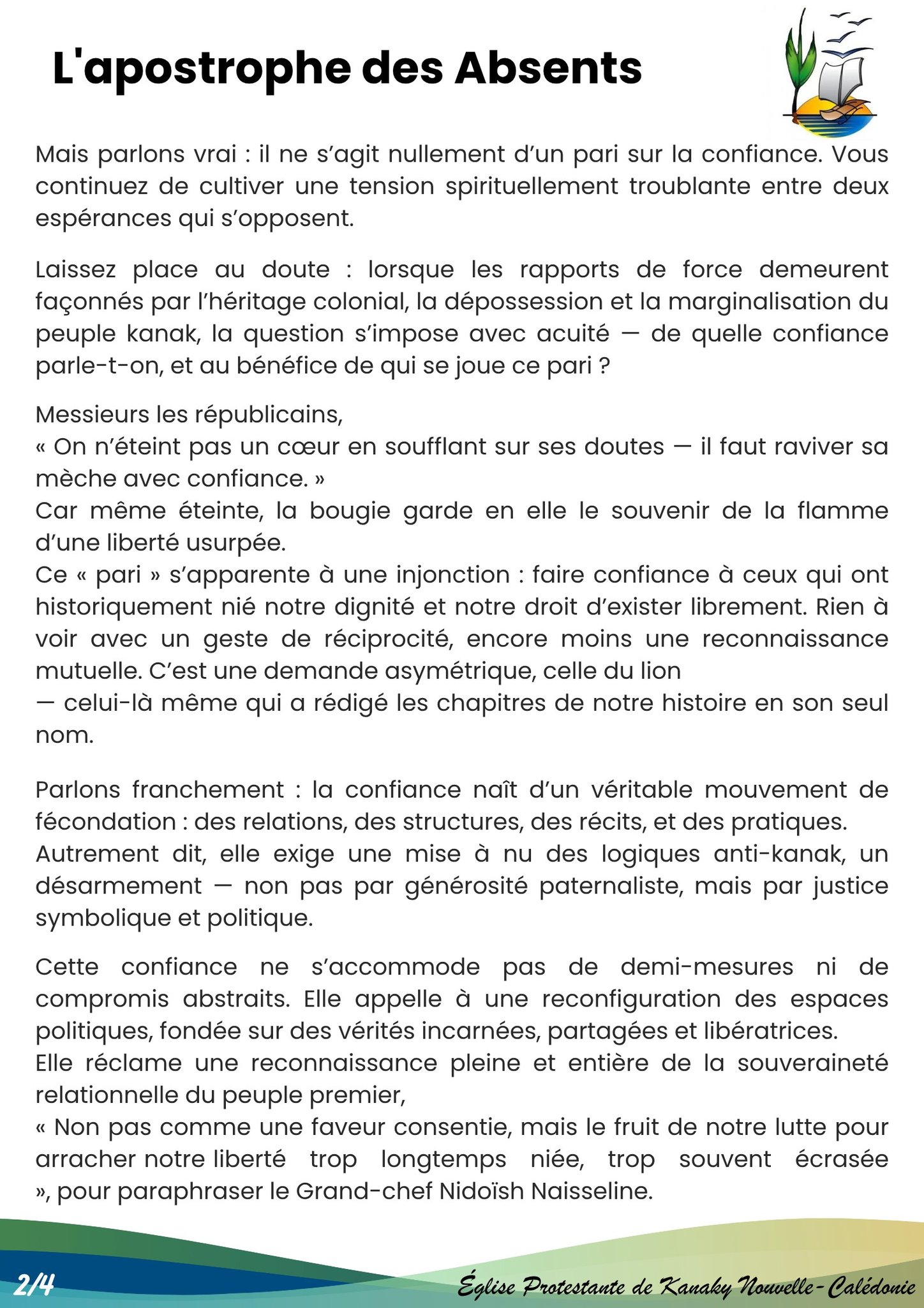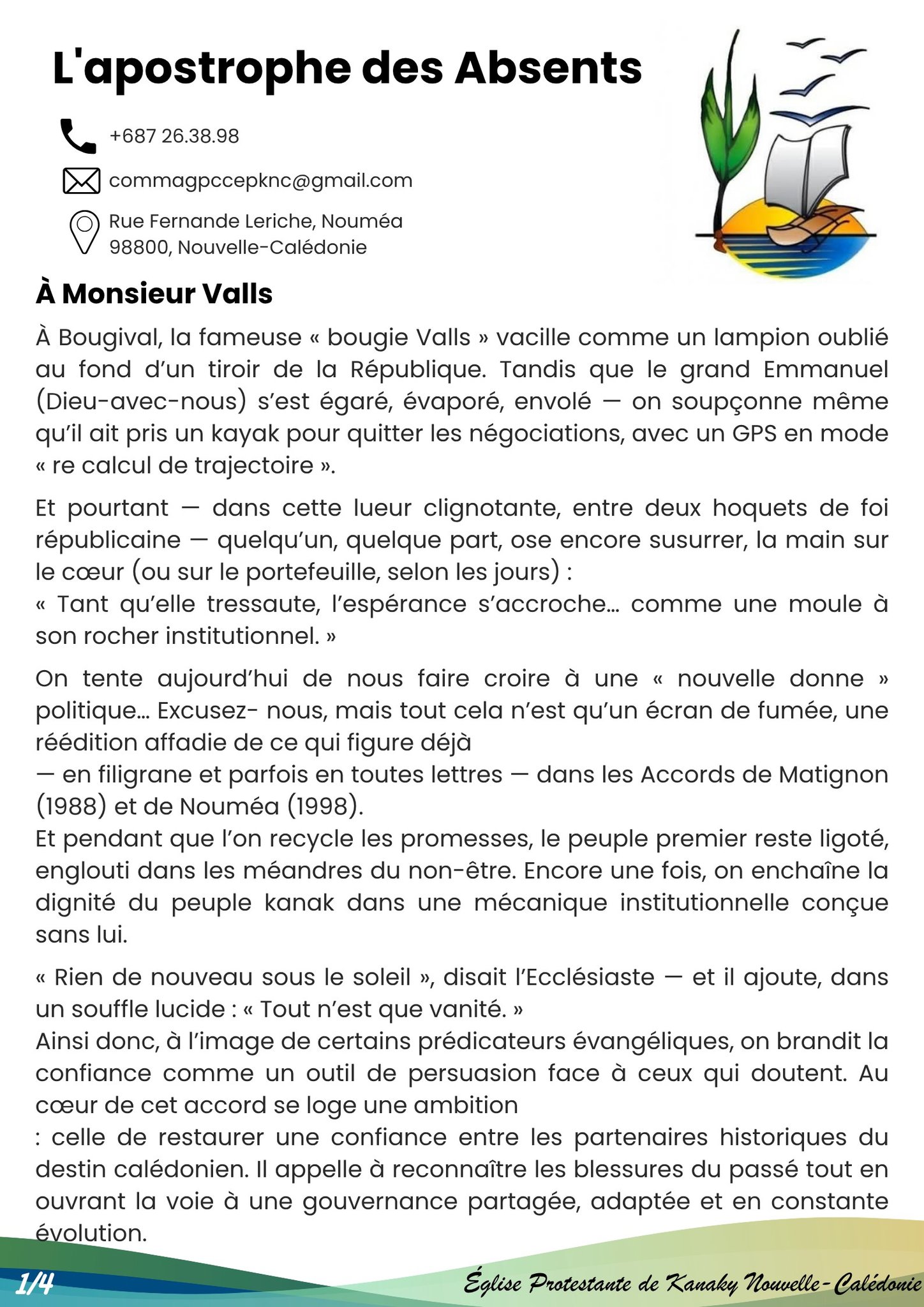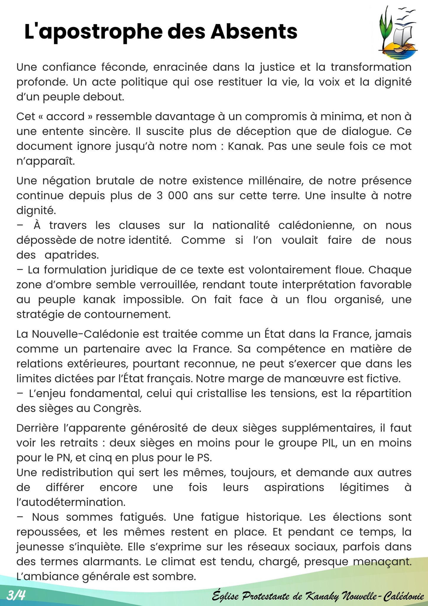 Dans une tribune intitulée L’Apostrophe des absents, le président de l’Église protestante de Kanaky-Nouvelle-Calédonie (EPKNC), KAEMO Var, choisit de sortir de son rôle spirituel pour endosser les habits du militant politique. Derrière des envolées lyriques et des références à la foi, c’est un discours résolument politique qu’il nous livre. Un discours qui brouille volontairement les frontières entre la chaire et l’Assemblée, entre le spirituel et le temporel. Et qui mérite qu’on remette les choses à leur place.