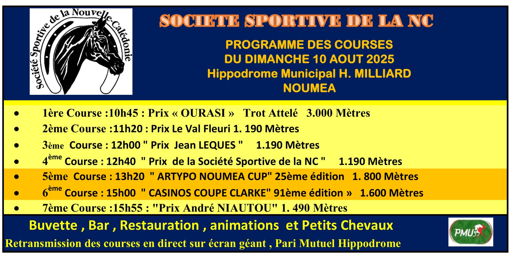 L’événement s’impose comme le point d’orgue du calendrier hippique calédonien, d’autant plus attendu cette année après l’interruption de 2024, liée aux graves émeutes de mai. Ce dimanche, la passion du galop reprendra ses droits, avec pas moins de 7 courses entre 10h45 et 16h, et deux temps forts incontournables : la Coupe Clark (15h) et la Nouméa Artypo Cup (vers 14h15), pour sa 25ᵉ édition.