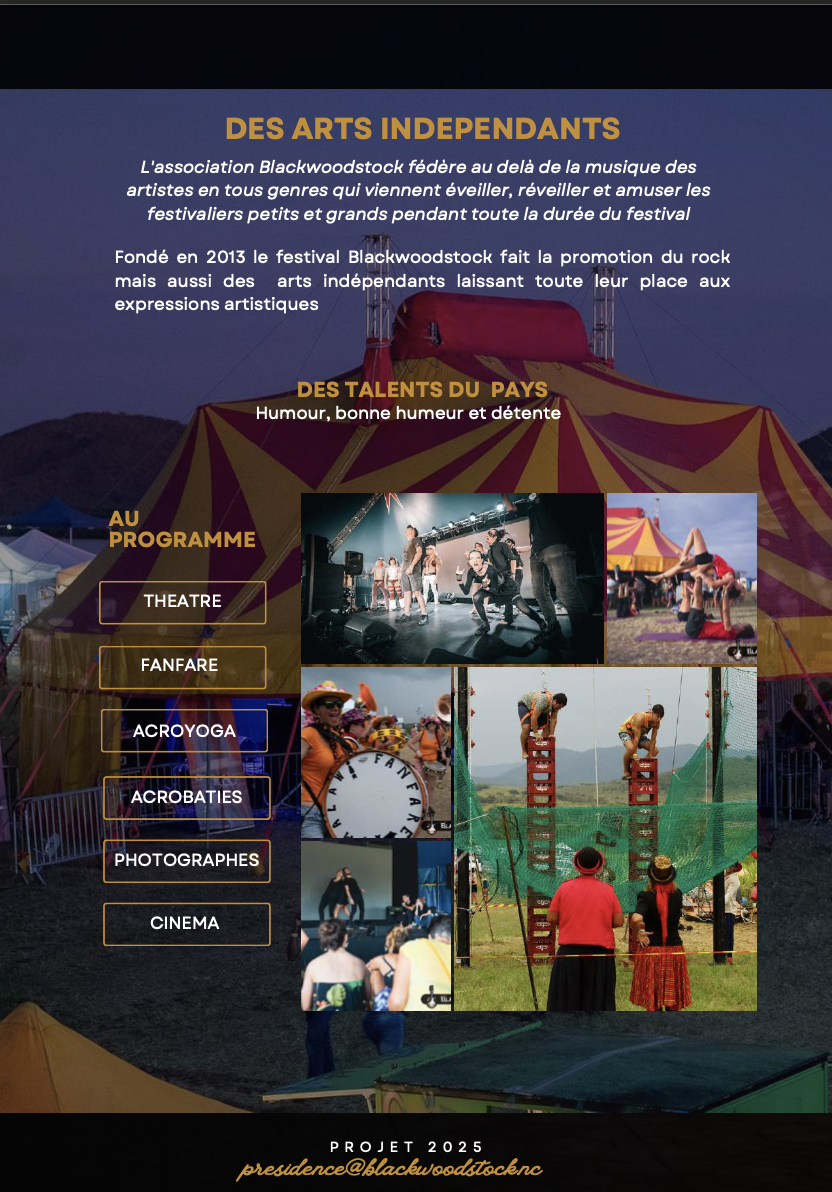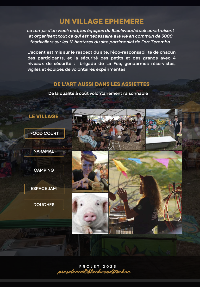 Le Blackwoodstock, ce n’est pas seulement des concerts. C’est un village éphémère de 12 hectares avec camping, food court, espace jam, nakamal, théâtre, cinéma en plein air, fanfare, acrobaties et acroyoga. Plus de 15 stands de restauration et d’artisanat complètent l’expérience, avec une politique de prix raisonnables et une éco-responsabilité assumée.