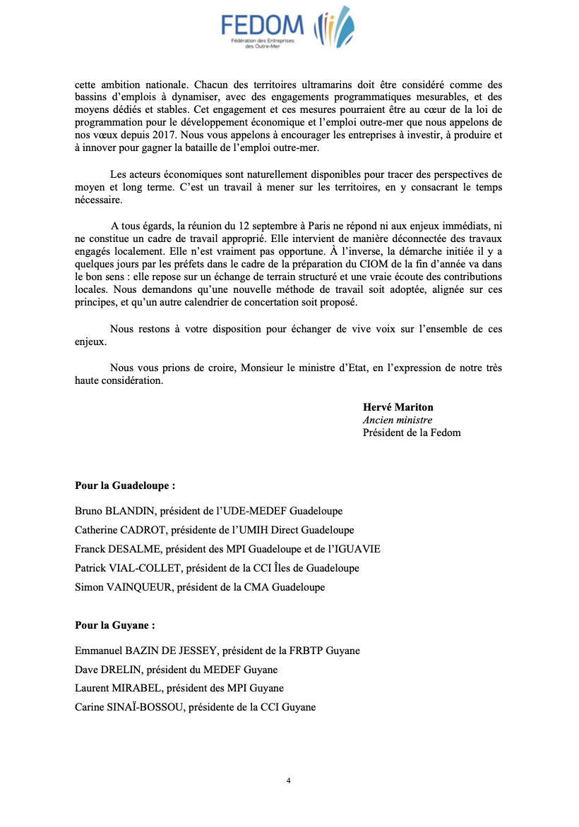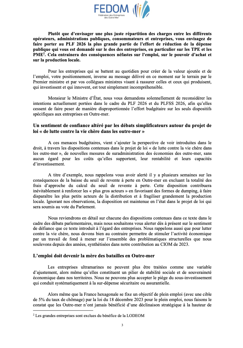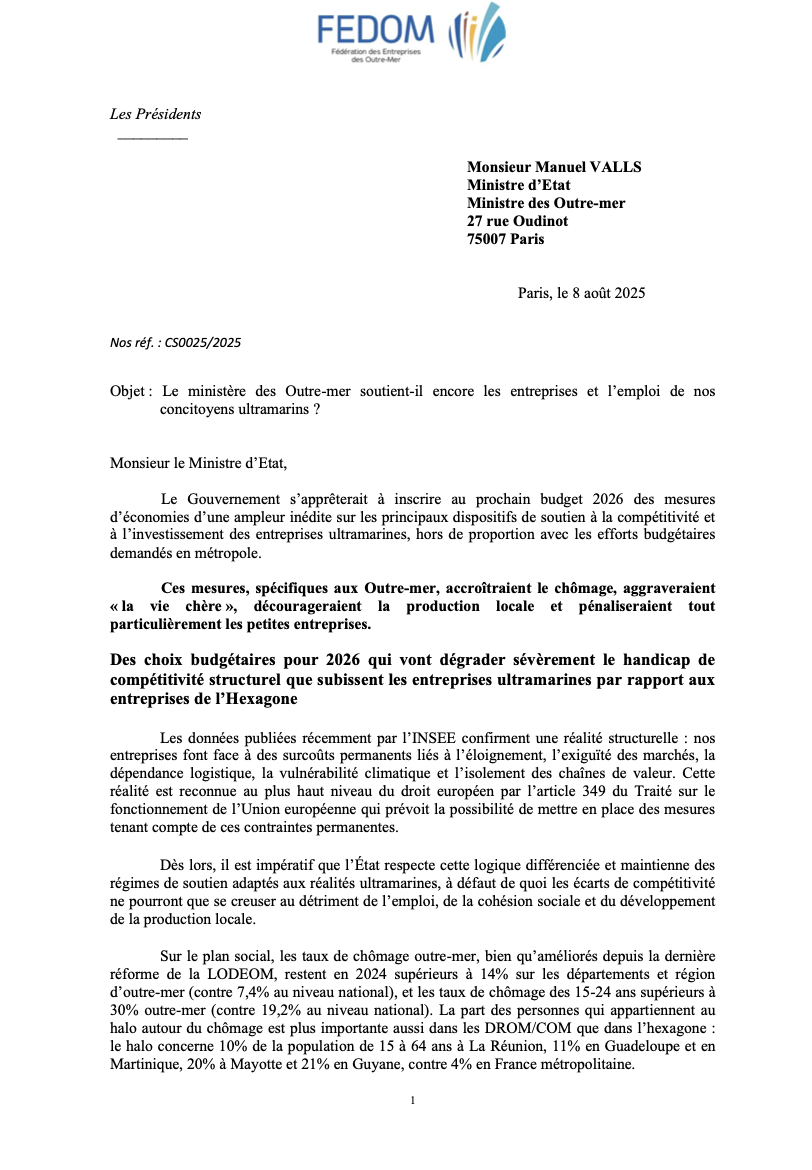 Le gouvernement prépare, pour le budget 2026, des coupes d’une ampleur inédite dans les dispositifs de soutien aux entreprises d’Outre-mer. Un front uni d’organisations patronales – de la Guadeloupe à la Polynésie – dénonce une atteinte directe à la compétitivité, à l’investissement et à l’emploi. C’est ce qui découle d’une lettre de la FEDOM (Fédération des entreprises ultramarines), adressée le 8 août dernier à Manuel Valls.