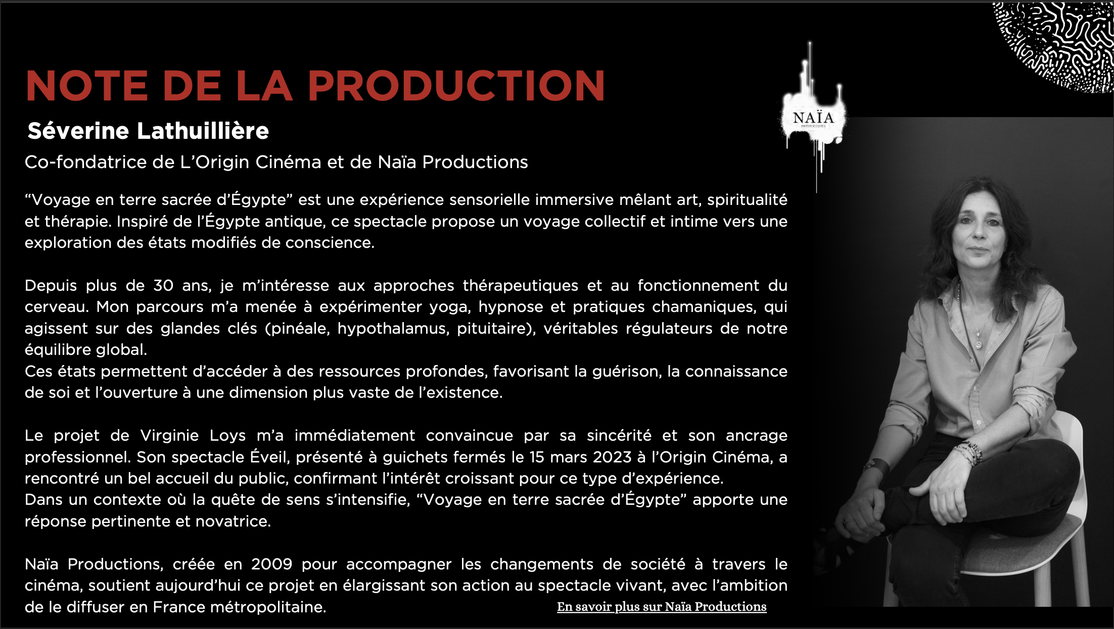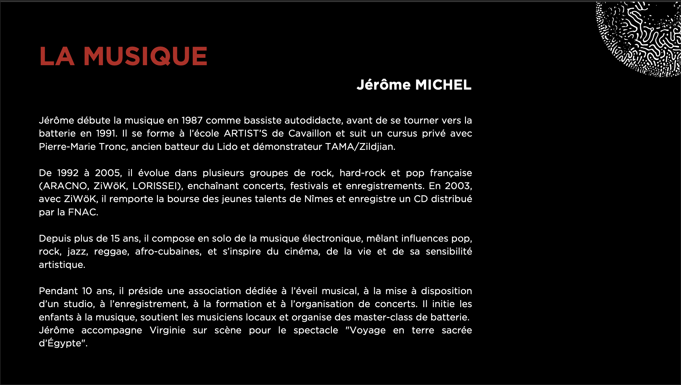 Pour cette nouvelle création, Virginie s’entoure de Jérôme Michel, musicien multi-instrumentiste formé au rock, au jazz et aux musiques du monde. Les compositions originales mêlent influences électroniques, rythmes traditionnels et sonorités inspirées du cinéma. Cette bande-son enveloppante sert de fil conducteur à l’hypnose collective.