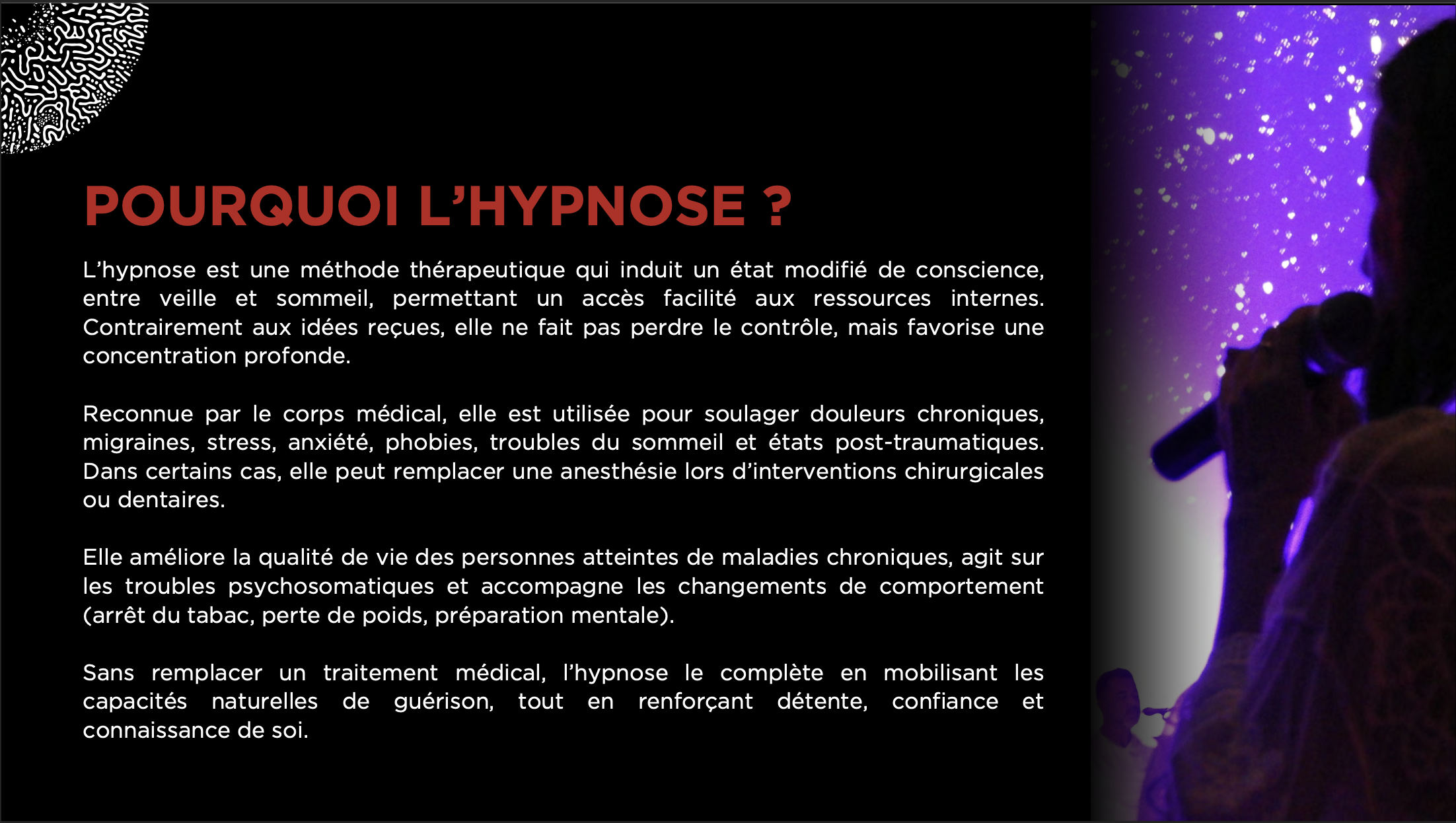 Au-delà du spectacle, l’hypnose est ici utilisée comme un outil de détente profonde et de découverte personnelle. Loin des clichés, elle ne fait pas perdre le contrôle mais favorise un état de concentration intense. Reconnue par le corps médical, elle aide à soulager le stress, les douleurs chroniques et certains troubles psychosomatiques.
