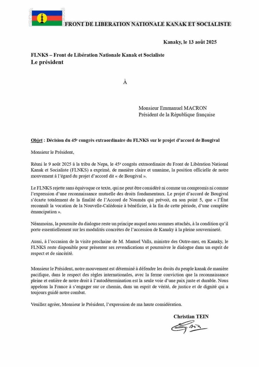 La portée politique de ce courrier n’échappe à personne : en s’adressant directement à Emmanuel Macron, Christian Tein tente de donner du poids à sa posture de fermeté. Mais au lieu d’ouvrir la porte à une discussion constructive, le FLNKS réduit le champ du dialogue aux seules « modalités de l’accession de Kanaky à la pleine souveraineté ». Une ligne maximaliste qui isole le mouvement et complique la recherche d’un compromis acceptable par tous.