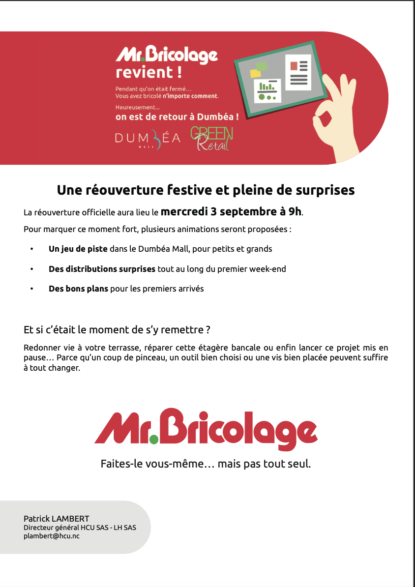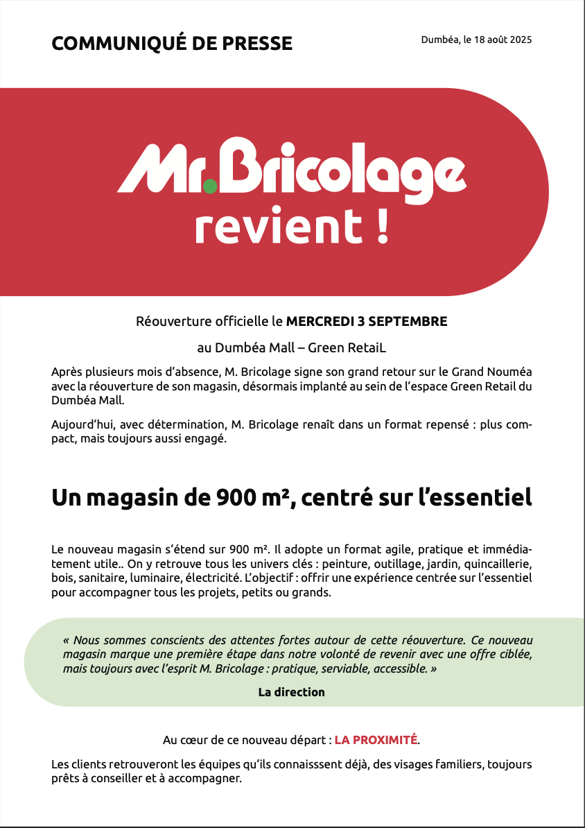 Après plusieurs mois d’absence, M. Bricolage signe son grand retour dans le Grand Nouméa. Le rendez-vous est fixé : mercredi 3 septembre à 9 h au Dumbéa Mall – Green Retail. Avec un format compact de 900 m², l’enseigne promet proximité, efficacité et convivialité.
