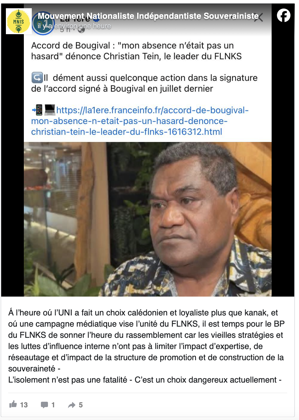 À la différence du MNIS, le camp de Paul Néaoutyine et de l’UNI (PALIKA, UPM) n’a pas renié sa signature. Il a choisi de tendre la main et d’assumer l’accord de Bougival. Un accord qualifié d’historique, car il propose une Nouvelle-Calédonie autonome mais pleinement française, cherchant à concilier les aspirations identitaires avec une réalité républicaine.