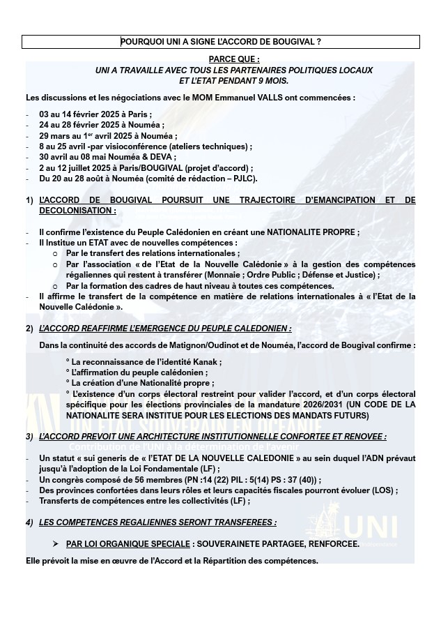 Pourquoi l’UNI a-t-elle signé l’accord de Bougival ? La réponse est simple : parce qu’il est le fruit de neuf mois de négociations intenses, menées avec l’ensemble des partenaires locaux et l’État, sous l’impulsion de Manuel Valls, alors ministre des Outre-mer. De Paris à Nouméa, en passant par Deva et Bougival, les discussions ont permis d’aboutir à un compromis solide. Là où le FLNKS choisit de renier sa signature, l’UNI assume sa responsabilité. Car l’histoire ne s’écrit pas avec des revirements, mais avec des engagements tenus.
