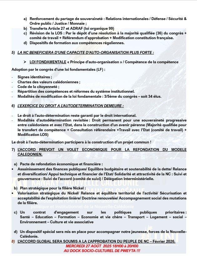 Cet accord n’est pas une improvisation : il s’inscrit dans la continuité des accords de Matignon et de Nouméa, tout en traçant une perspective claire. Il organise une trajectoire d’émancipation et de décolonisation ordonnée, affirme l’existence d’un peuple calédonien et prépare la montée en puissance d’un véritable État de Nouvelle-Calédonie.