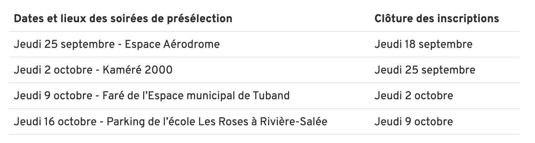 La compétition débutera par quatre soirées de présélection organisées dans différents quartiers :