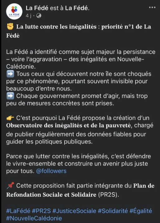 Dans un communiqué diffusé sur les réseaux sociaux, La Fédé affirme que « la lutte contre les inégalités est sa priorité n°1 ». L’organisation syndicale explique que « tous ceux qui découvrent notre île sont choqués par ce phénomène, pourtant souvent invisible pour beaucoup d’entre nous » et propose la création d’un Observatoire des inégalités et de la pauvreté, financé par l’argent public, « chargé de publier régulièrement des données fiables pour guider les politiques publiques ».
