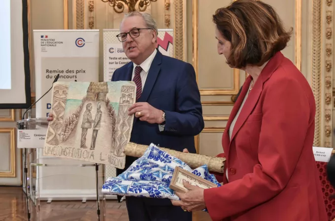 Parmi les classes récompensées figuraient des projets venus d’Épernay, d’Ancenis ou encore de L’Isle-Adam. Mais cette édition a également mis en lumière un territoire souvent éloigné de Paris : la Nouvelle-Calédonie. Les lycéens du lycée La Pérouse de Nouméa ont brillé en organisant une cérémonie de la « fête de la citoyenneté », le 24 septembre, jour hautement symbolique pour l’archipel. Ils ont offert deux tableaux au président Ferrand et à Caroline Pascal, représentante du ministère.