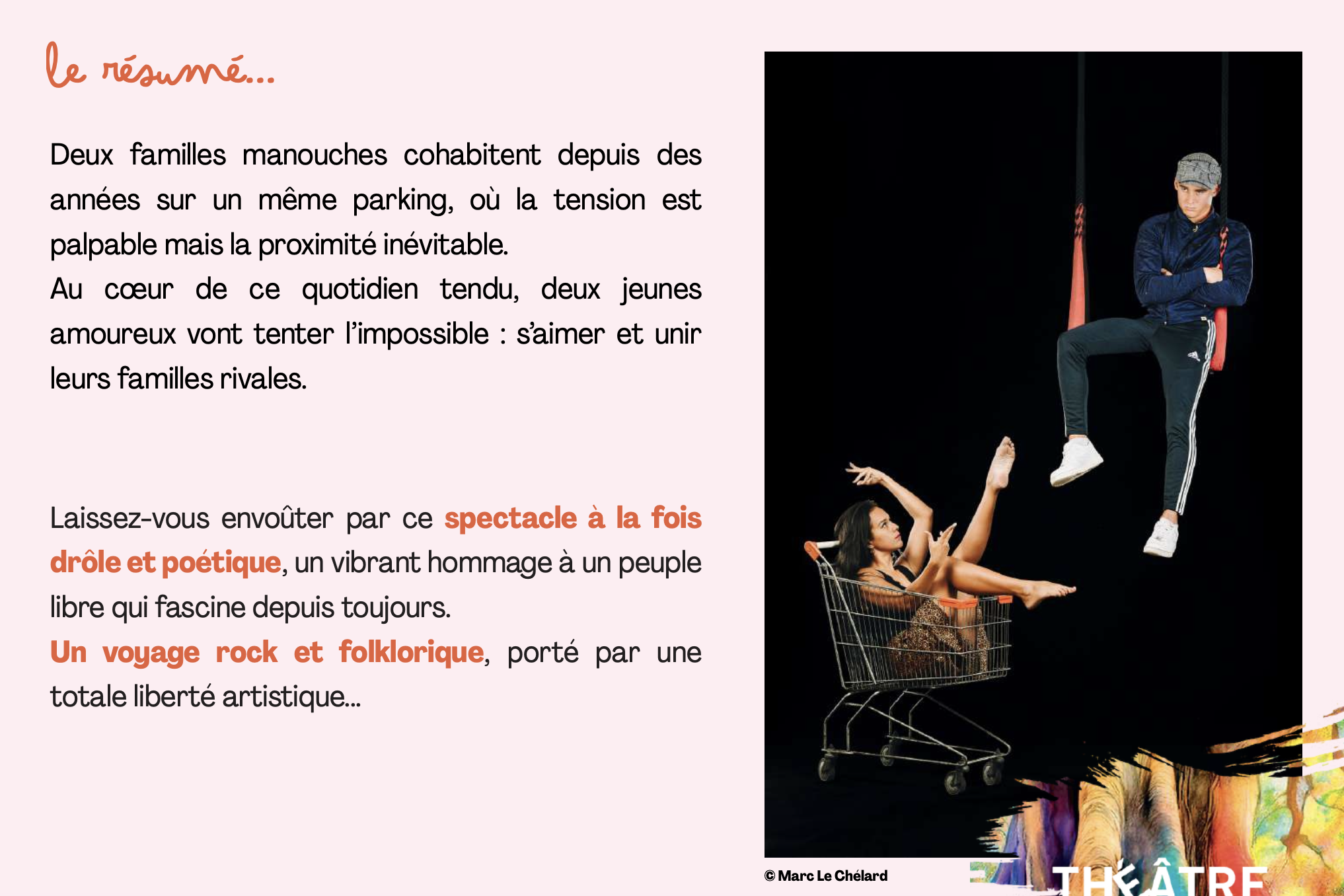 Pour relier les numéros, un fil narratif simple et efficace : deux familles manouches qui cohabitent sur un parking. Conflits, défis, coups d’éclat et bien sûr une histoire d’amour qui bouscule les rivalités. L’esthétique est assumée : fresque populaire, humour, chaleur et un imaginaire de la route. Les tableaux jouent des contrastes (duo intimiste / ensemble, silence / explosion musicale) et utilisent l’agrès comme véritable vecteur de récit, pas seulement comme démonstration technique.
