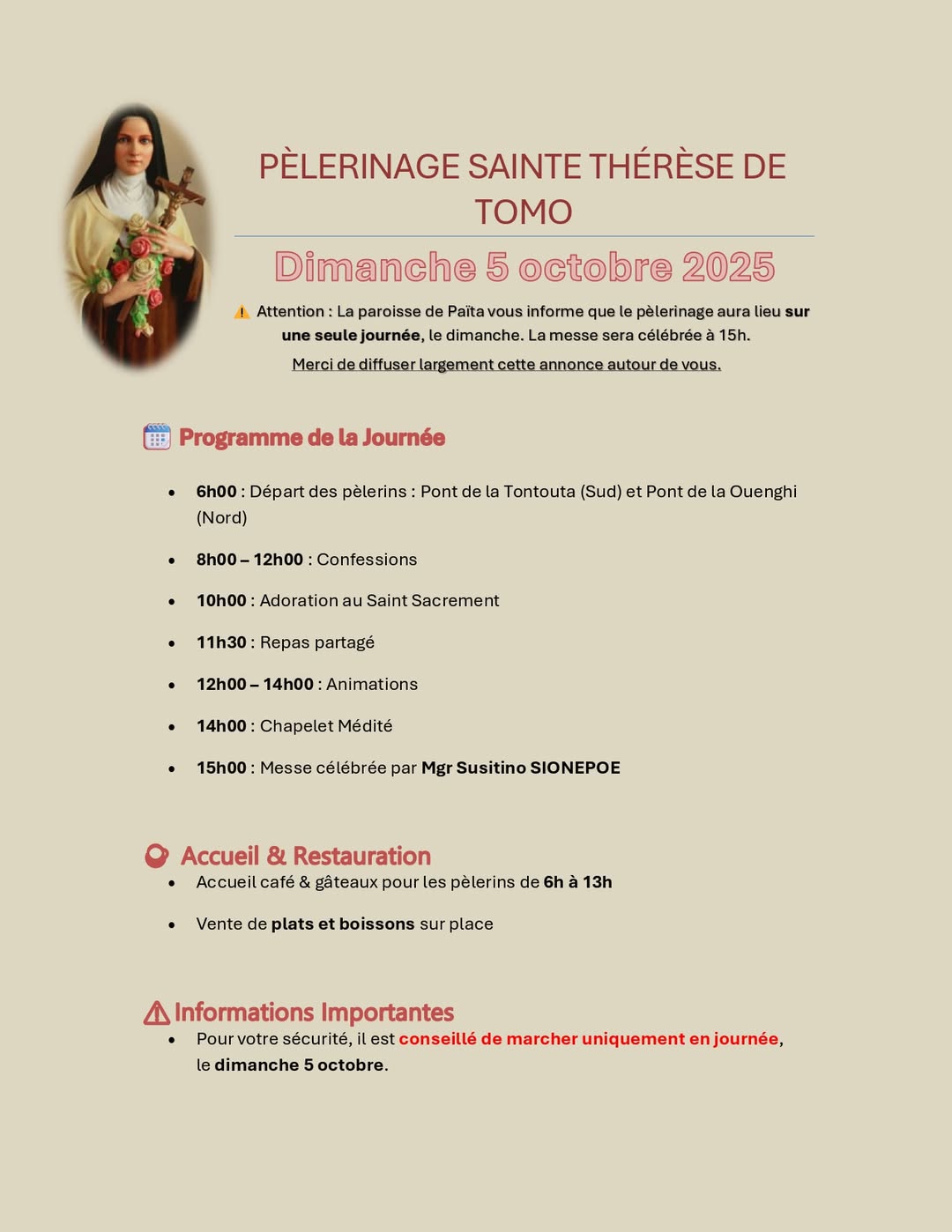Les organisateurs insistent sur un message clair : pour des raisons de sécurité, il est recommandé de ne marcher que le dimanche. Cet appel à la prudence n’enlève rien à la dimension spirituelle, bien au contraire : il recentre le pèlerinage sur l’essentiel, la rencontre avec le Christ à travers l’exemple de Sainte Thérèse de Lisieux, patronne des missions et modèle d’humilité.