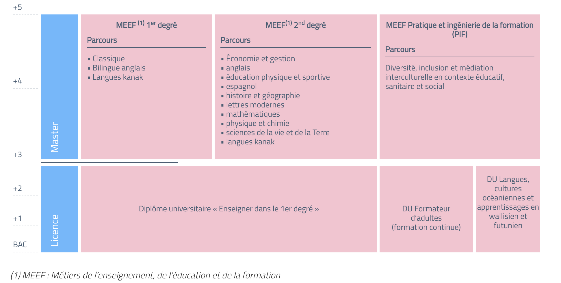 Pour les professeurs des écoles, le recrutement se fait par concours après une licence. Les admis suivent une année de formation professionnelle au sein de l’INSPÉ de Nouvelle-Calédonie. La formation se distingue par sa pluridisciplinarité, son haut degré de professionnalisation et par des stages répétés dès la première année. Elle intègre aussi une option d’enseignement des langues kanak ou de l’anglais, adaptée à la réalité culturelle locale.