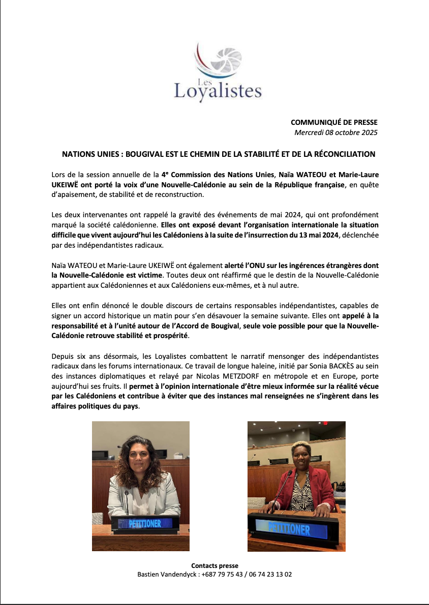 À New York, la 4ᵉ Commission de l’ONU a entendu une parole ferme venue de Nouméa : Bougival n’est pas un slogan, c’est une boussole. Sur la scène internationale, Naïa Wateou et Marie-Laure Ukeiwë ont défendu un cap de stabilité, appelé à la réconciliation, et rappelé que « le destin calédonien appartient aux Calédoniens ». Leur message tient en trois points : lucidité sur les violences de mai 2024, alerte sur les ingérences étrangères, et exigence de cohérence politique autour de l’Accord de Bougival : unité, responsabilité, reconstruction.