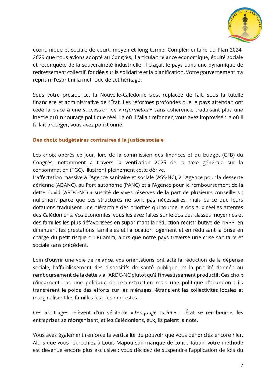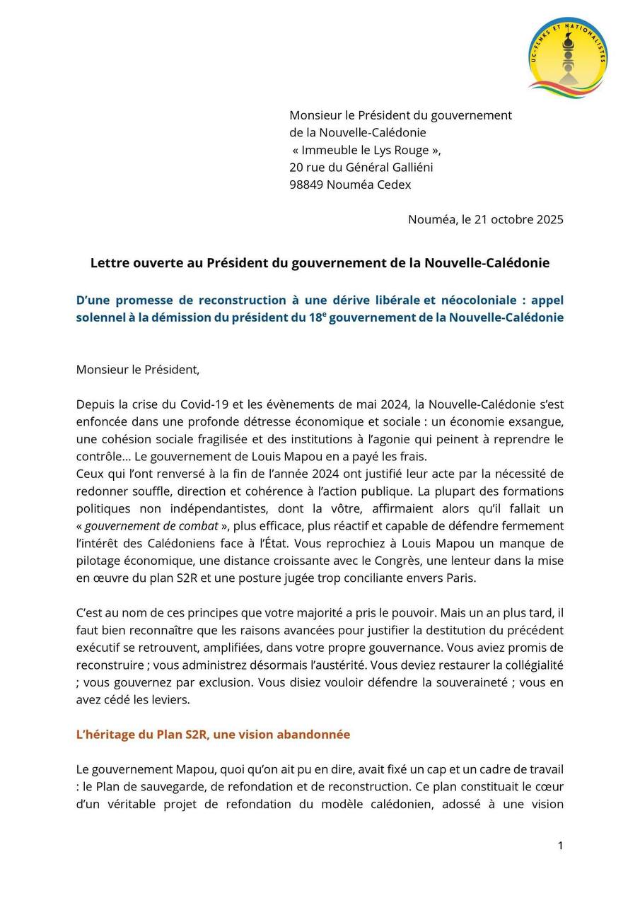 Le ton est grave, le verbe tranchant. Dans une lettre ouverte datée du 21 octobre 2025, le mouvement Uc-FLNKS et Nationalistes interpelle directement le président du gouvernement de la Nouvelle-Calédonie. En cause : une politique jugée « néocoloniale », contraire aux promesses de reconstruction et de justice sociale formulées après les crises du Covid-19 et des émeutes de 2024. Pour ses signataires, la majorité actuelle a trahi ses engagements en optant pour une gestion libérale et centralisée, au détriment des Calédoniens les plus modestes.