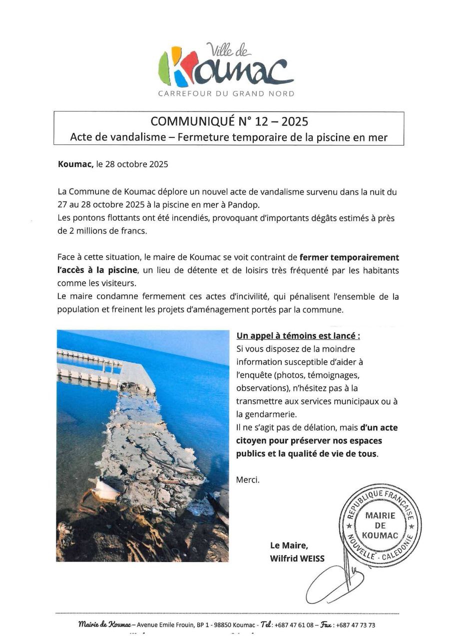 Dans la nuit du 27 au 28 octobre, un nouvel acte de vandalisme a frappé Koumac. Les pontons flottants de la piscine en mer de Pandop ont été incendiés, causant des dégâts estimés à près de 2 millions de francs CFP. Un coup dur pour la commune du Grand Nord, qui voit l’un de ses lieux emblématiques de détente réduit en cendres.