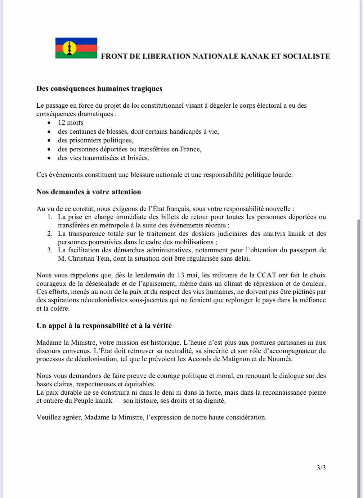 Le communiqué déroule un argumentaire bien connu : le refus de reporter le 3ᵉ référendum, la nomination de Sonia Backès, et le dégel du corps électoral seraient les symboles d’une France « coloniale » et « injuste ». L’État aurait, selon eux, « trahi sa parole » et « détruit la confiance ».