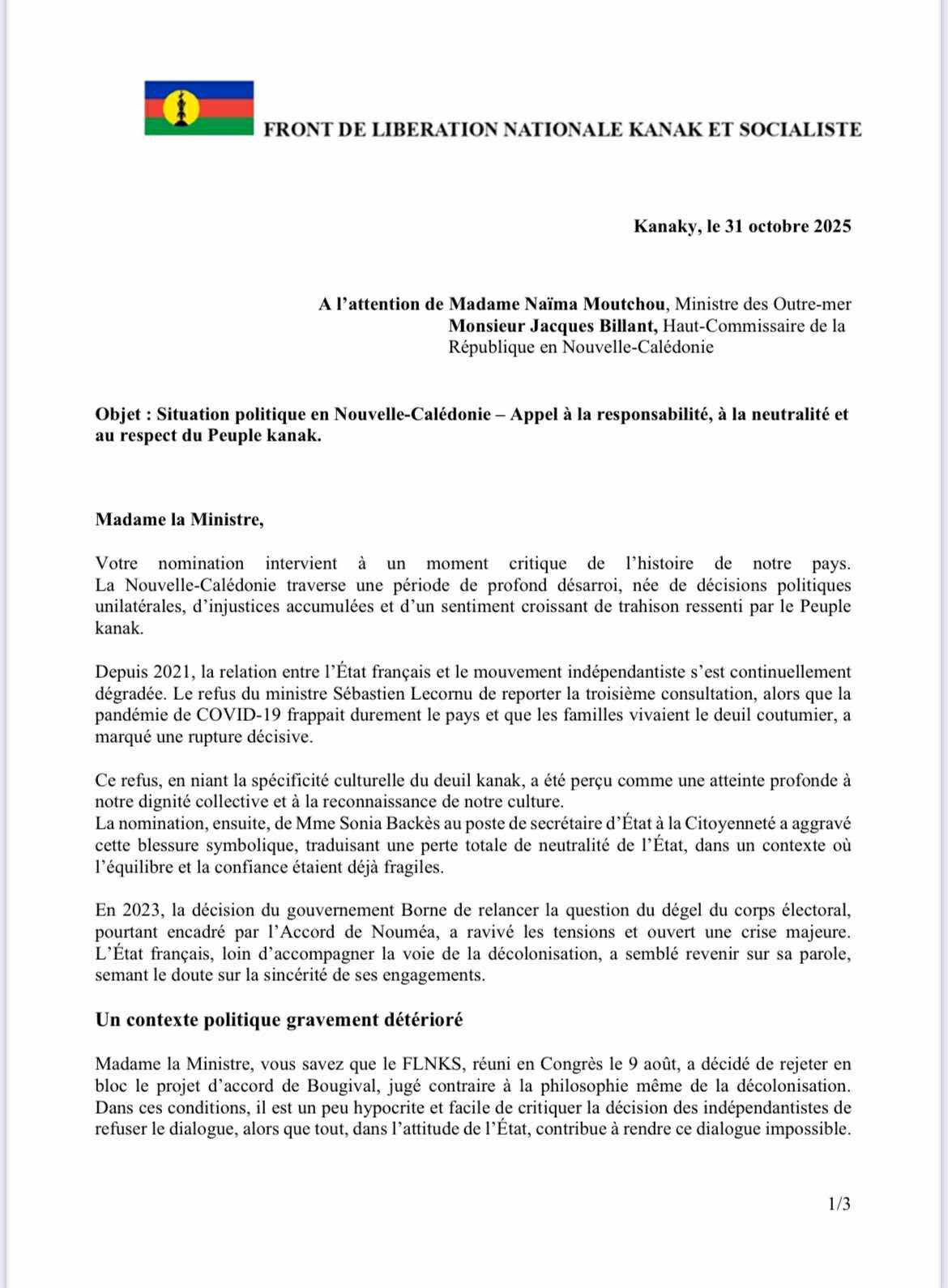 À peine nommée, Naïma Moutchou hérite d’un dossier explosif : la Nouvelle-Calédonie. Le FLNKS, dans un communiqué daté du 31 octobre 2025, lui adresse une longue lettre mêlant griefs, menaces voilées et exigences. Le ton est posé d’emblée : l’État est accusé de trahison, de partialité et de mépris du peuple kanak.