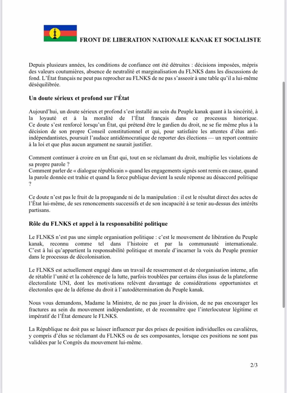 Mais derrière les mots, le fond reste le même : le FLNKS refuse toute autocritique et se présente comme l’unique voix légitime du pays.