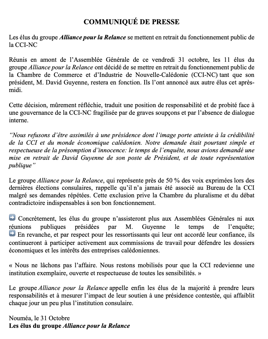 Nous refusons d’être assimilés à une présidence dont l’image porte atteinte à la crédibilité de la CCI et du monde économique calédonien,