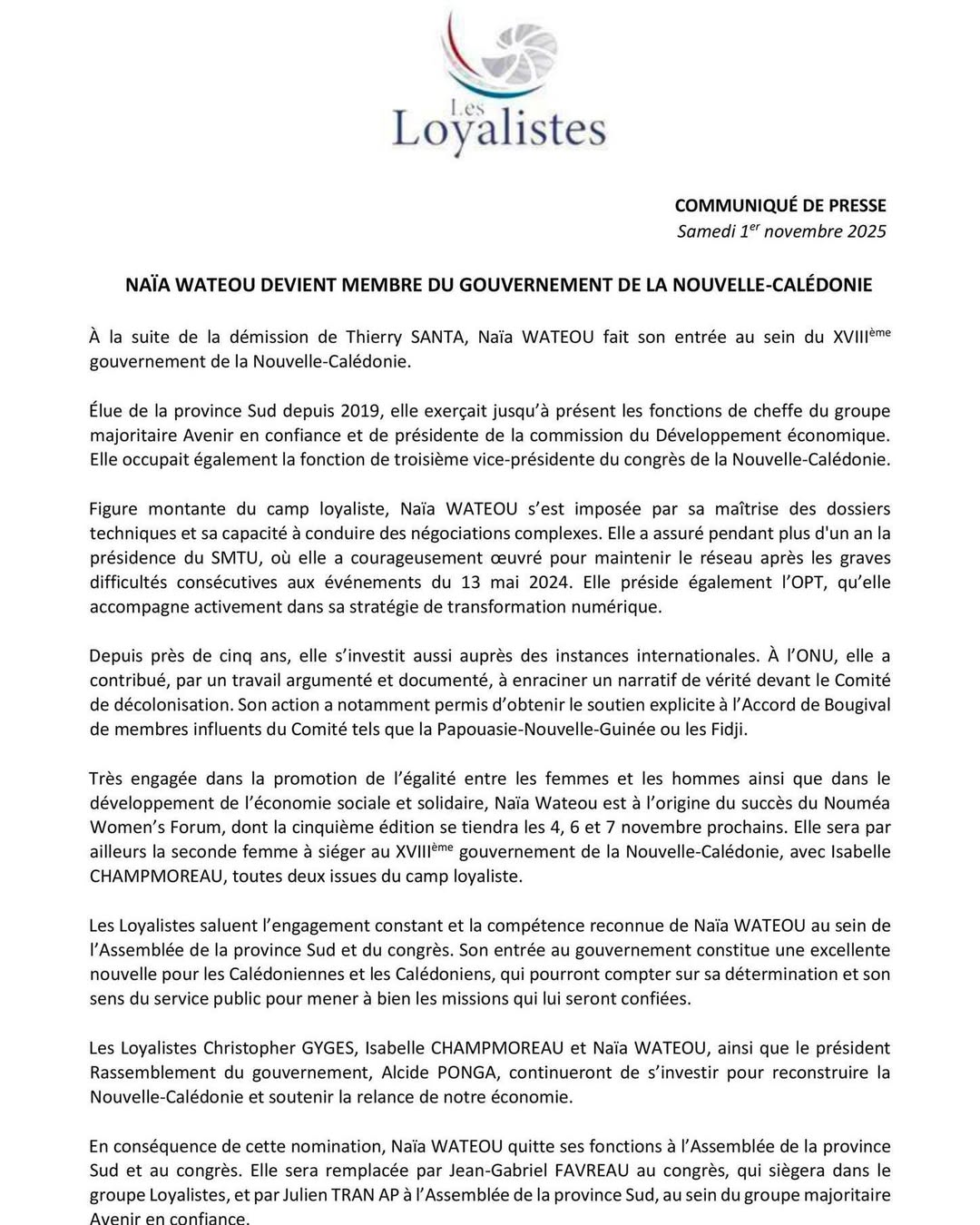 Dans la mécanique institutionnelle calédonienne, chaque départ active immédiatement la montée du suivant de liste. Ici, c’est Naïa Wateou, issue des groupes Rassemblement et Loyalistes lors de l’élection des membres du gouvernement de janvier 2025, qui s’impose naturellement comme la successeure légitime. Au 1er novembre, la stratégie est claire : pas de vacance du pouvoir, pas de flottement, mais un relais continu pour maintenir la cohérence du camp majoritaire.