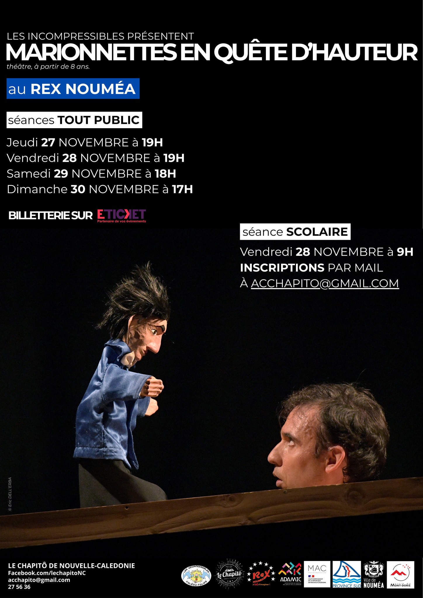Le spectacle se jouera du 27 au 30 novembre au Rex Nouméa, avec quatre séances tout public : jeudi 27 et vendredi 28 à 19 h, samedi 29 à 18 h et dimanche 30 à 17 h. Les tarifs annoncés vont « de 1 500 F à 2 000 F », ce qui inscrit la proposition dans une logique de théâtre accessible, notamment pour les familles. La billetterie est ouverte via la plateforme Eticket NC, à l’adresse indiquée par l’organisateur, et « sur place 1 h avant le spectacle », dans la limite des places disponibles.