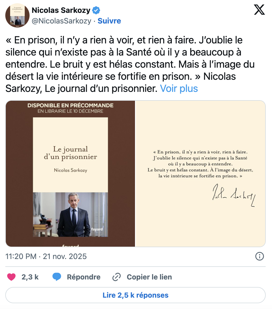 Nicolas Sarkozy annonce la parution de Le Journal d’un prisonnier pour le 10 décembre chez Fayard. L’ouvrage est disponible en précommande avant sa sortie nationale en librairie. Le message a été publié officiellement sur le réseau X par l’ancien président.