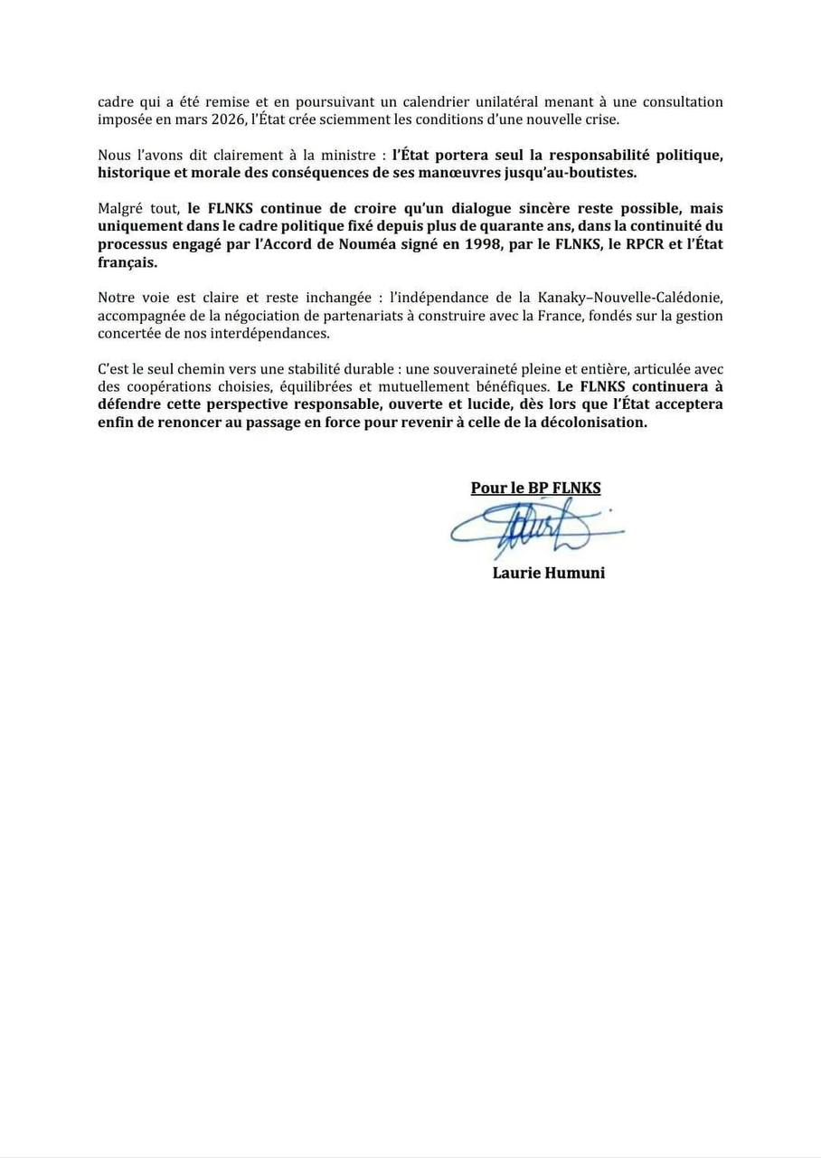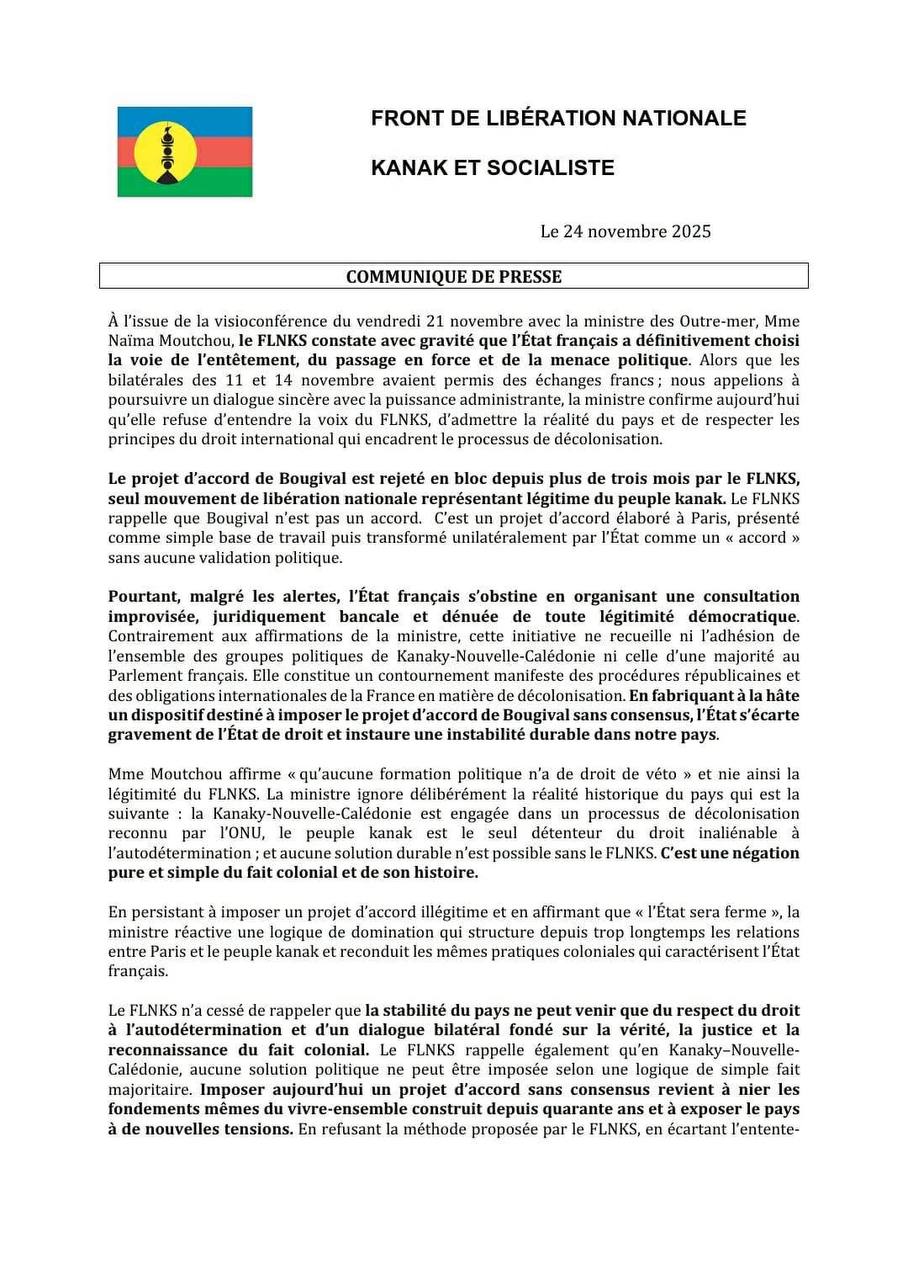 Le communiqué accuse l’État de vouloir imposer un accord « sans consensus », mais c’est bien le FLNKS qui refuse d’entrer dans la phase de discussion institutionnelle.