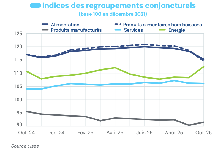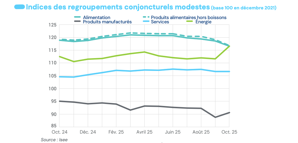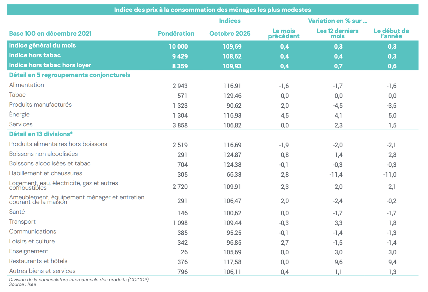 Là où l’indice général reste stable, celui des ménages les plus modestes progresse de +0,4 % en un seul mois, après un repli en septembre. Une tendance qui confirme une pression ciblée sur les foyers les plus vulnérables. Sur un an, ces ménages subissent une hausse des prix de +0,3 %, tandis que l’ensemble de la population bénéficie d’une baisse de -0,4 %, creusant un écart social préoccupant.