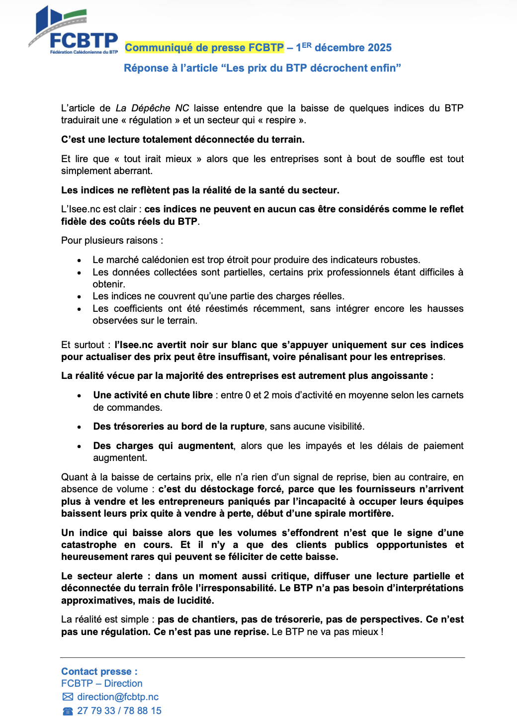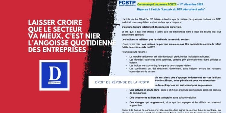 La FCBTP a tenu à exercer un droit de réponse après la publication, de notre article évoquant une « régulation » des prix du BTP : https://old.ladepeche.nc/2025/11/30/indices-btp-la-chute-silencieuse-qui-rebat-les-cartes/