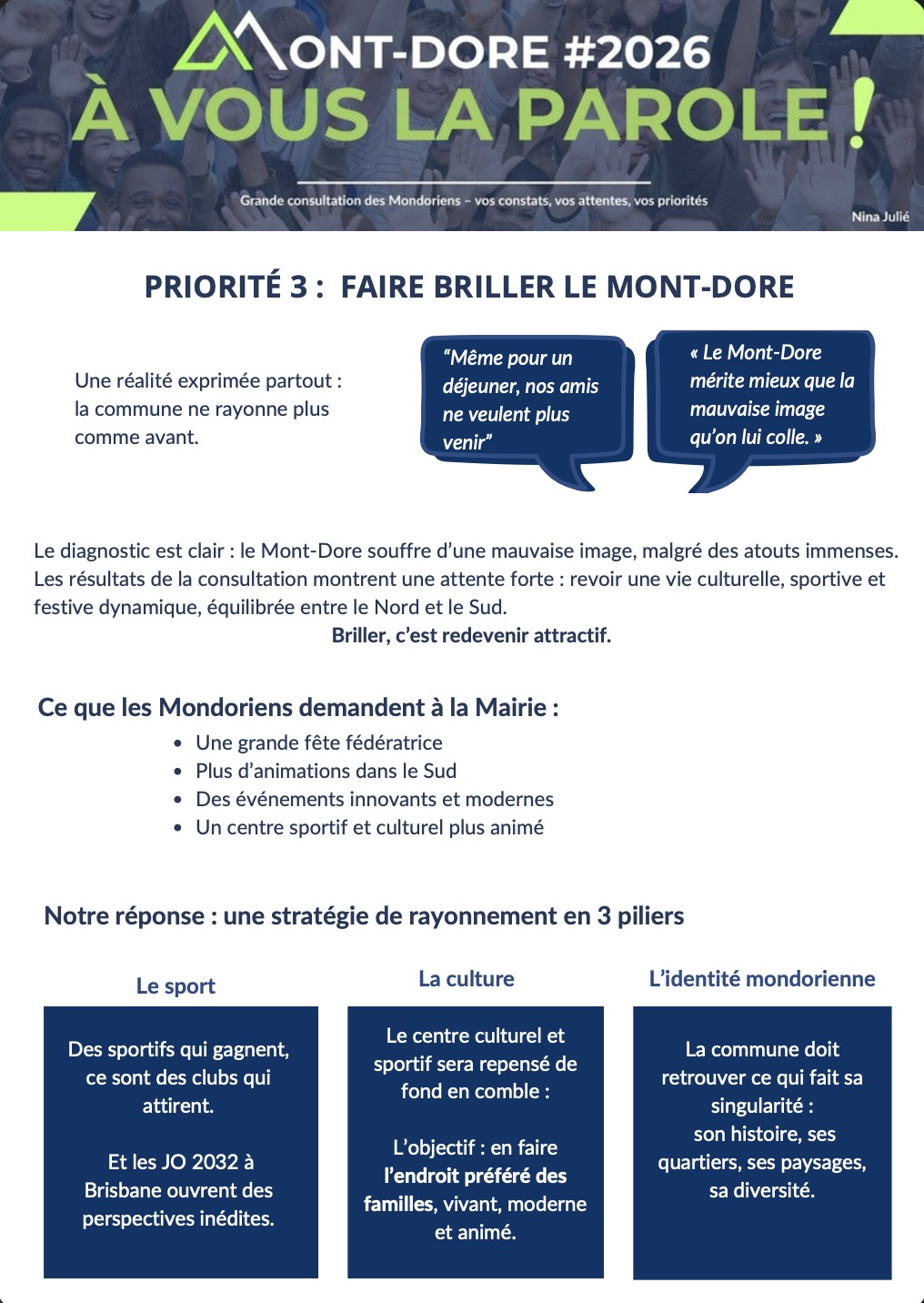 Face à cela, les habitants réclament une vie culturelle et sportive plus dynamique, davantage d’événements fédérateurs et un centre culturel repensé en profondeur. La candidate Nina Julié propose d’ailleurs une stratégie axée sur trois piliers, le sport, la culture et l’identité mondorienne, convaincue que la préparation des Jeux de Brisbane 2032 peut ouvrir de nouvelles opportunités pour les clubs et les jeunes talents. L’enjeu est clair : faire du Mont-Dore un lieu où l’on a envie de vivre, de sortir, et de rester.