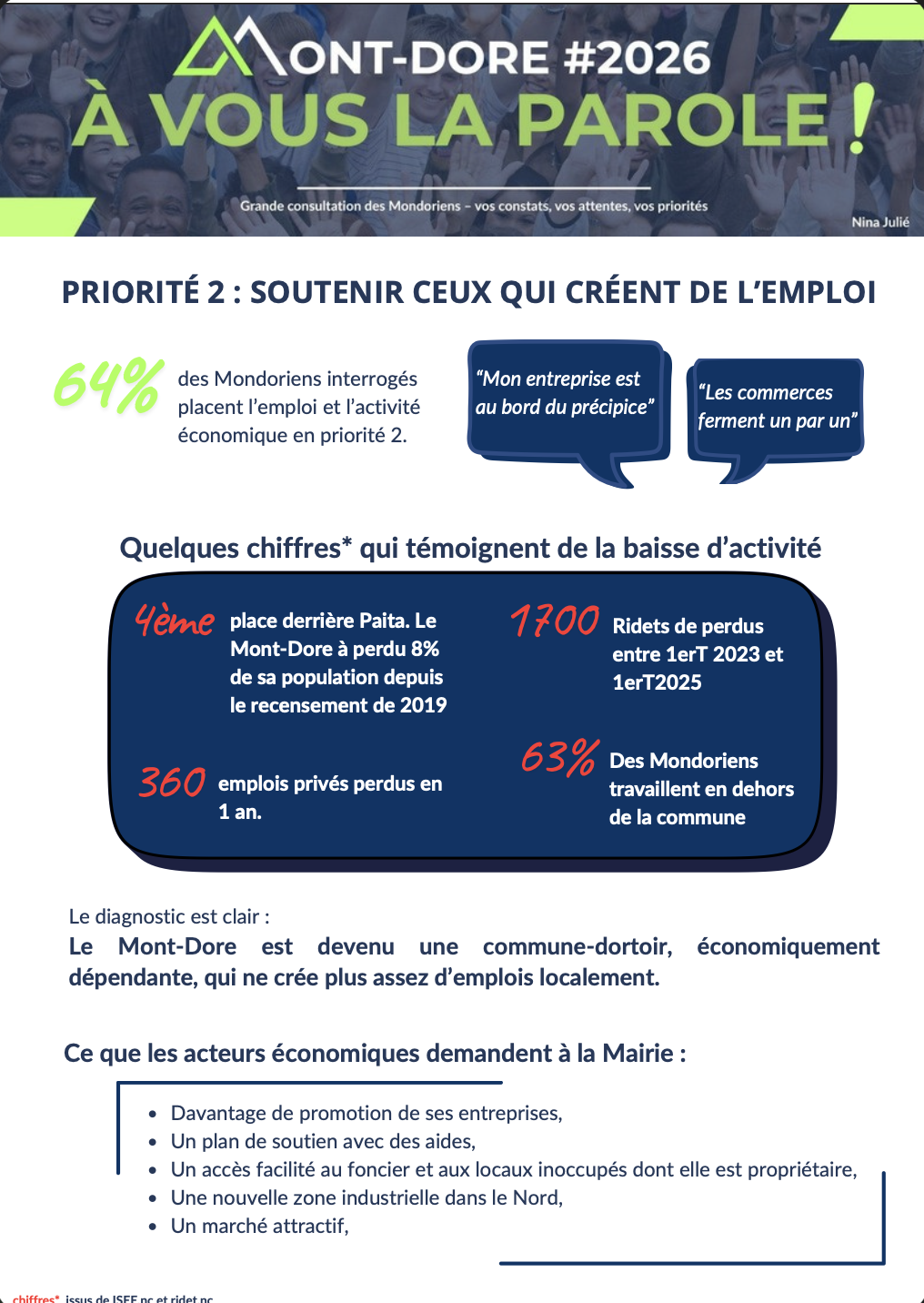 Les chiffres illustrent cet effritement : 8 % de la population du Mont-Dore ont disparu depuis 2019, plus de 360 emplois privés ont été perdus en un an, et 1 700 radiations ont été enregistrées entre début 2023 et début 2025. La commune fonctionne de plus en plus comme un territoire-dortoir, où 63 % des actifs travaillent ailleurs. Beaucoup estiment que la municipalité doit soutenir davantage les entreprises locales, faciliter l’accès au foncier et redynamiser les zones d’activités, notamment dans le Nord de la commune. L’enjeu est de taille : rétablir un cycle économique vertueux pour éviter que le Mont-Dore ne devienne un territoire de transit plutôt qu’un pôle de vie.