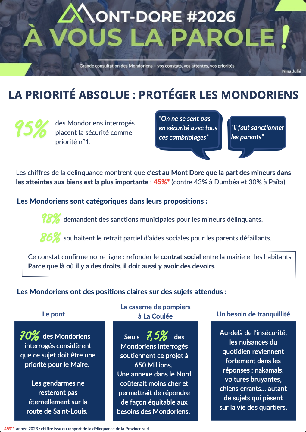 Les données recueillies confirment ce ressenti. Le Mont-Dore présente la plus forte proportion de mineurs impliqués dans les atteintes aux biens de toute la province Sud, avec 45 % des infractions de ce type commises par des jeunes en 2023. Ce constat nourrit une demande de fermeté. Une large majorité d’habitants souhaite l’instauration de sanctions municipales ciblant les jeunes délinquants, mais aussi la possibilité de réduire certaines aides sociales lorsque la responsabilité parentale fait défaut. Le dossier souligne également que la présence renforcée des gendarmes à Saint-Louis ne peut être considérée comme une solution durable, un avertissement qui résonne comme un appel à une politique municipale plus solide et plus cohérente.