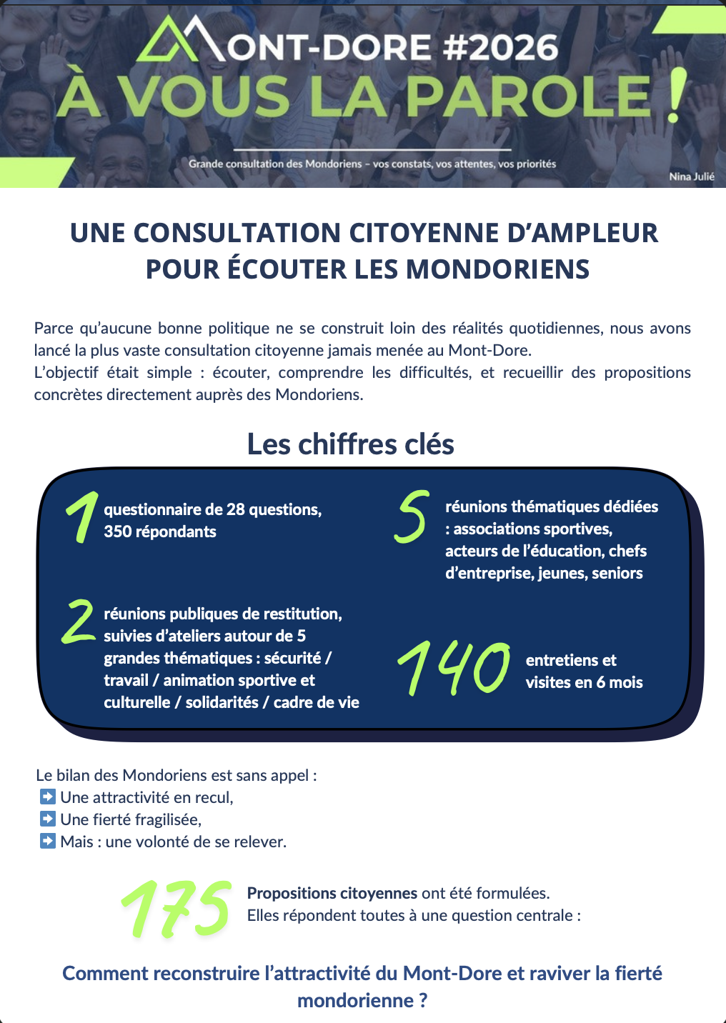 La campagne municipale 2026 s’ouvre sur un diagnostic sans fard : le Mont-Dore traverse une crise de confiance. Pour la première fois, une candidate met sur la table un travail massif d’écoute citoyenne, mené pendant six mois, qui révèle un territoire inquiet mais déterminé à se relever. C’est ce que présente l’équipe de Nina Julié, sur son rapport fondé sur 350 réponses à un questionnaire, plusieurs réunions publiques et plus de 140 entretiens individuels .