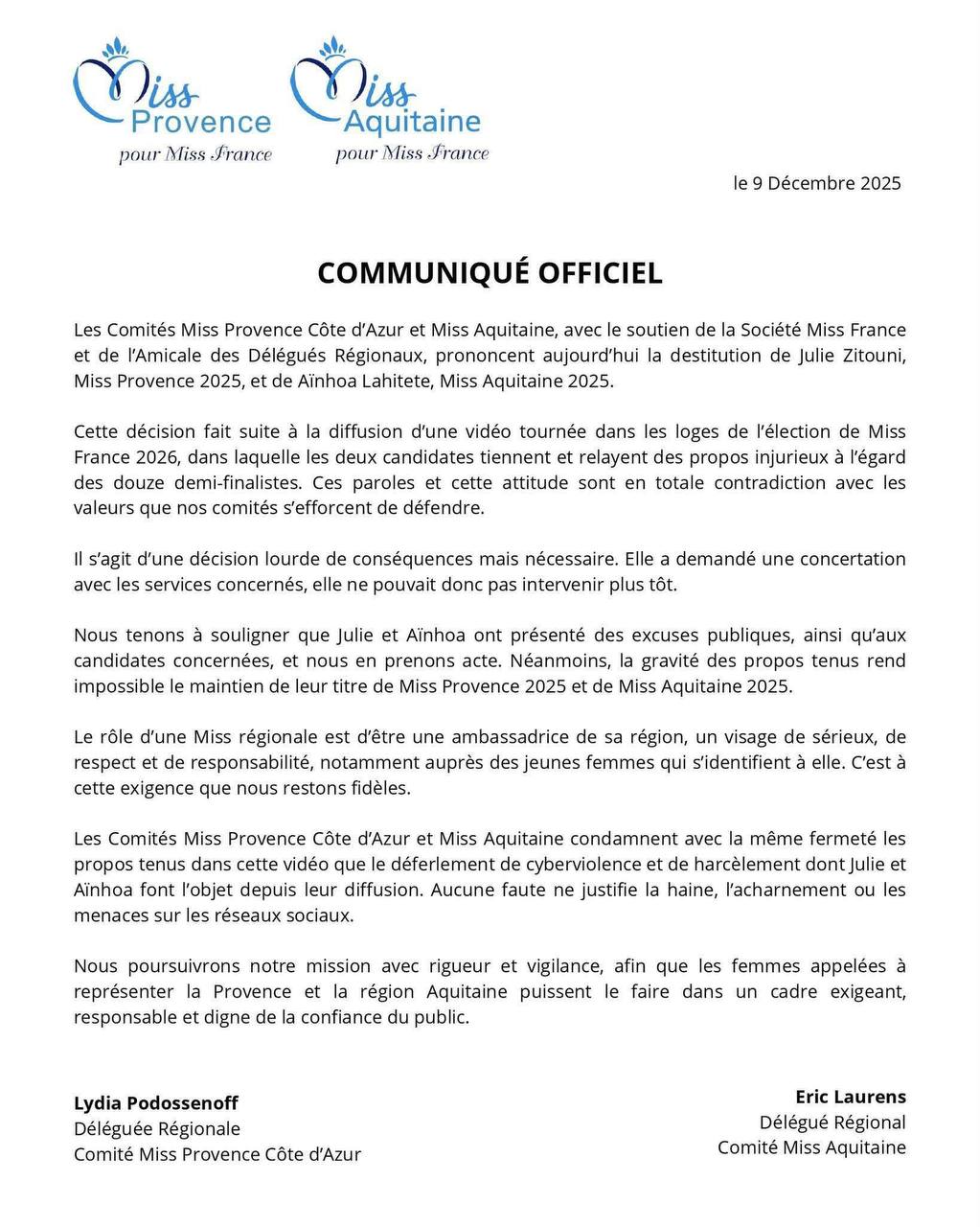 À chaque saison, la machine Miss France promet élégance, exemplarité et valeurs républicaines. Et chaque année désormais, elle se heurte à une réalité bien plus rugueuse : polémiques, vidéos fuitées, règlements de comptes et tempêtes médiatiques. La destitution, ce 9 décembre 2025, de Julie Zitouni (Miss Provence 2025) et Ainhoa Lahiette (Miss Aquitaine 2025) en est le dernier épisode.