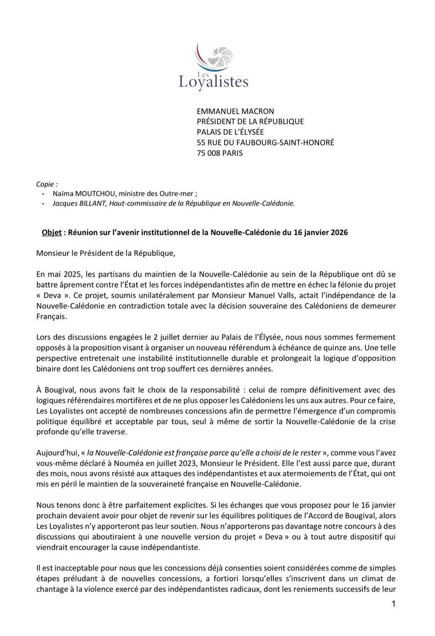 Daté de décembre, le courrier des Loyalistes s’adresse directement au Président de la République, avec copies à la ministre des Outre-mer et au haut-commissaire. L’objet est sans ambiguïté : la réunion du 16 janvier 2026 ne saurait être le prétexte à une remise en cause des équilibres actés à Bougival.
