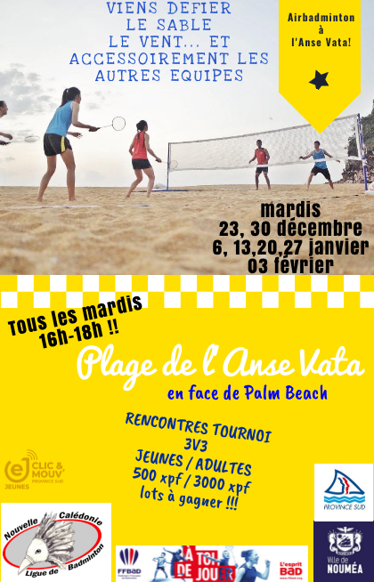 Airbadminton Estival Tour : tous les mardis à l’Anse Vata, la Ligue de badminton invite le public à jouer sur le sable, en 3 contre 3.